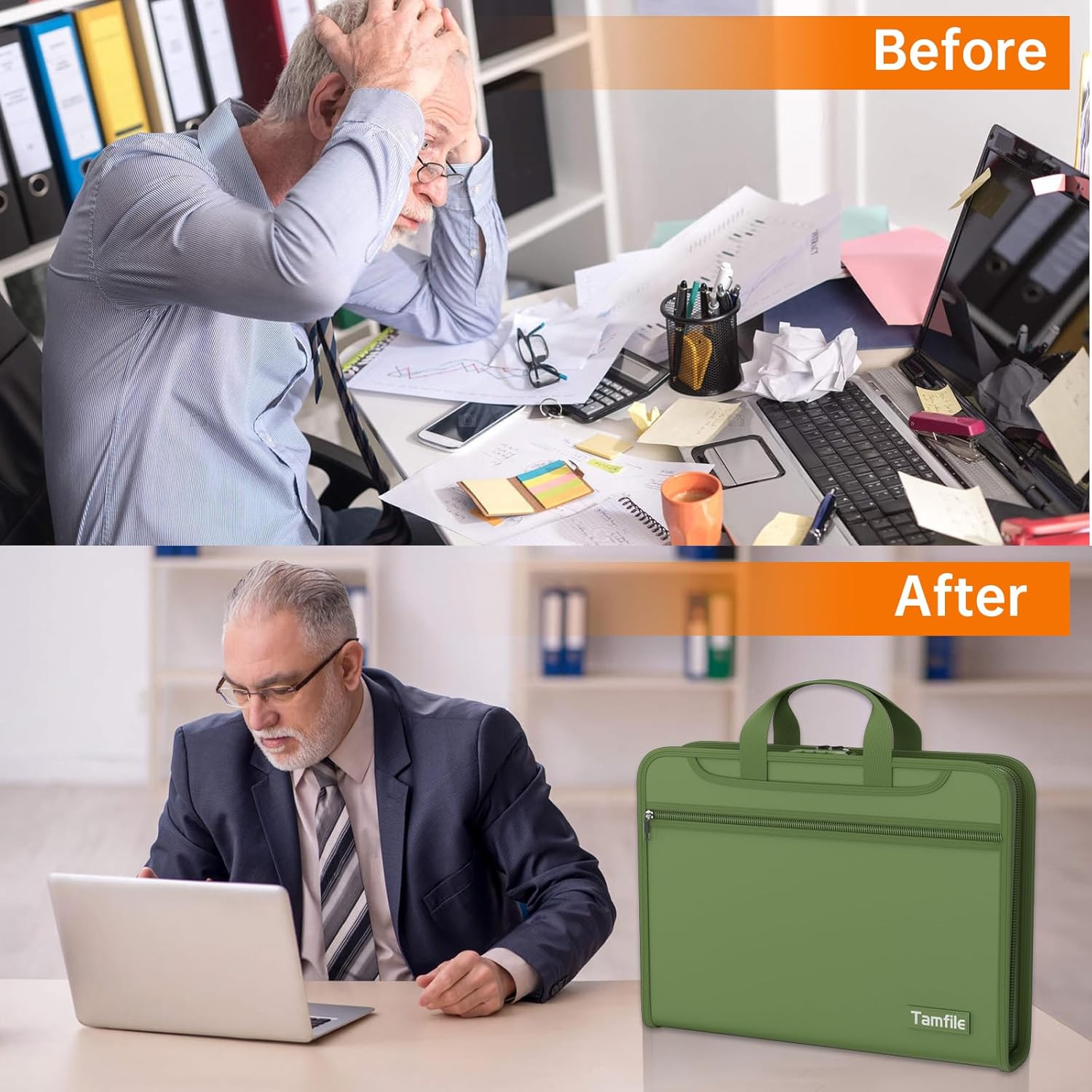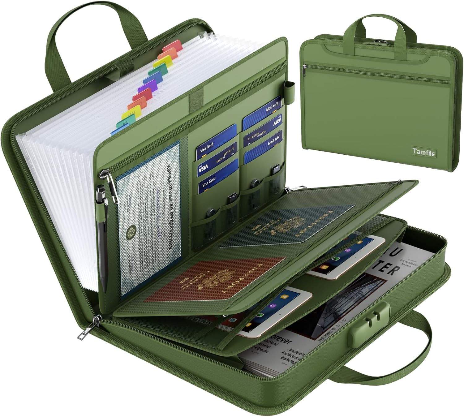 - [Large capacity & multiple pockets] Tamfile gives you more capacity than other products. It contains a 13 accordion document pocket with labels, three zipper pockets, one expandable pocket, three passport-sized pockets, 2 pen slots, with 6 card slots + 4 USB slots and attached small mesh pocket. You can safely store important documents while efficiently categorizing and finding them.