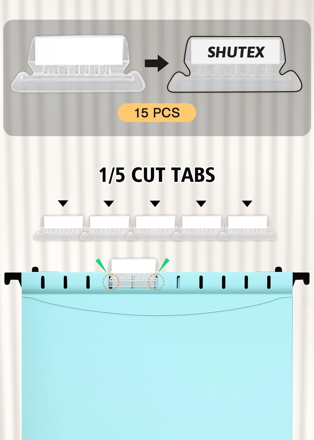 - [INSERT FILE FOLDER TABS] Traditional plastic tabs, all clear, and paper inserts that you write on to identify the folder's contents. The tabs can be placed at various positions along the top of the hanging folder