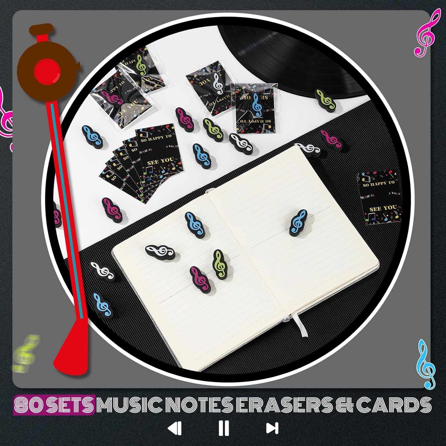 80 Sets Back to School Gifts for Students Funny Novelty Erasers Bulk Musical Note Erasers with Greeting Cards First of School Classroom Rewards from Teachers
