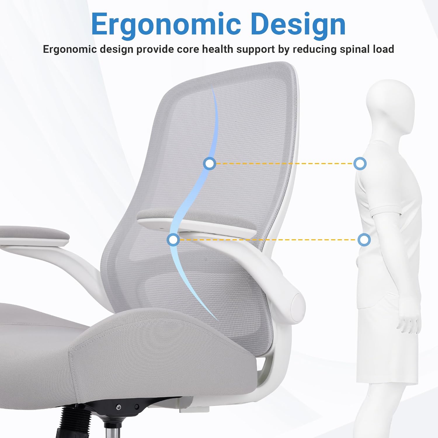 HYLONE Heavy Duty Office Chair, 5" Thickened Seat Ergonomic Desk Chair with Adjustable Armrests, Home Office Computer Chairs for Long Hours Mesh Executive Chair(White Base & Grey)