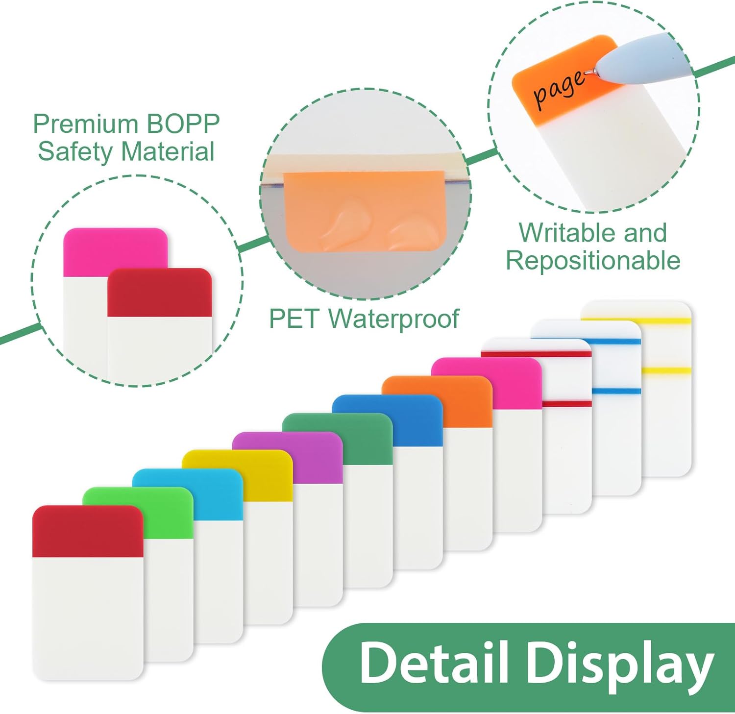 - [High-quality PET Material] Sticky tabs for books are made of PET material, which is waterproof and durable, non-toxic and odorless, safe and healthy. Tabs for books have special adhesives with transparent self-adhesive parts, which do not block text and make reading and viewing smoother