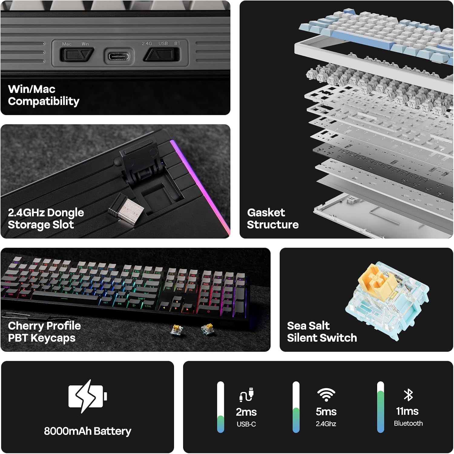 - Long-Lasting Wireless Keyboard: Liberate your setup with the ultimate freedom of a stable wireless keyboard boasting the outstanding 8000mAh battery. Unlocking a realm of unrestricted movement and sustained performance with this tri-mode wireless keyboard, without frustrating cable drag hindering swift mouse movements, for seamless transition between up to 5 paired devices under cable, 2.4Ghz and Bluetooth modes. PC, Mac laptop, Android tablet or gaming console, whichever devices you game on, the 160-hour wire-free battery life make inconvenient mid-game recharge a worry in the past.