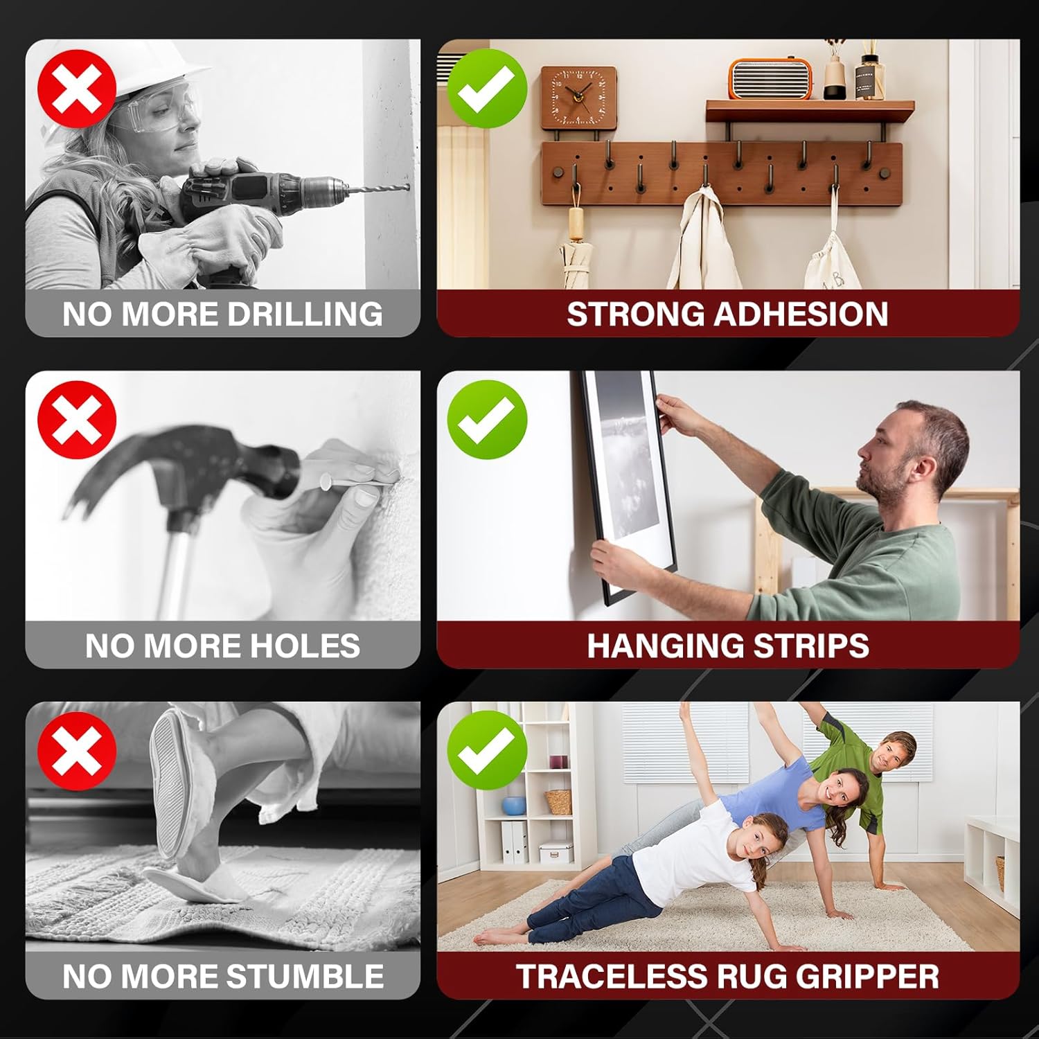 - 【𝐖𝐢𝐝𝐞 𝐀𝐩𝐩𝐥𝐢𝐜𝐚𝐭𝐢𝐨𝐧】 Suitable for a variety of smooth surfaces in the home, office, or outdoor settings. Perfect for mounting photos, hanging hooks, securing carpets, or fixing flower pots, phone holders, and more.