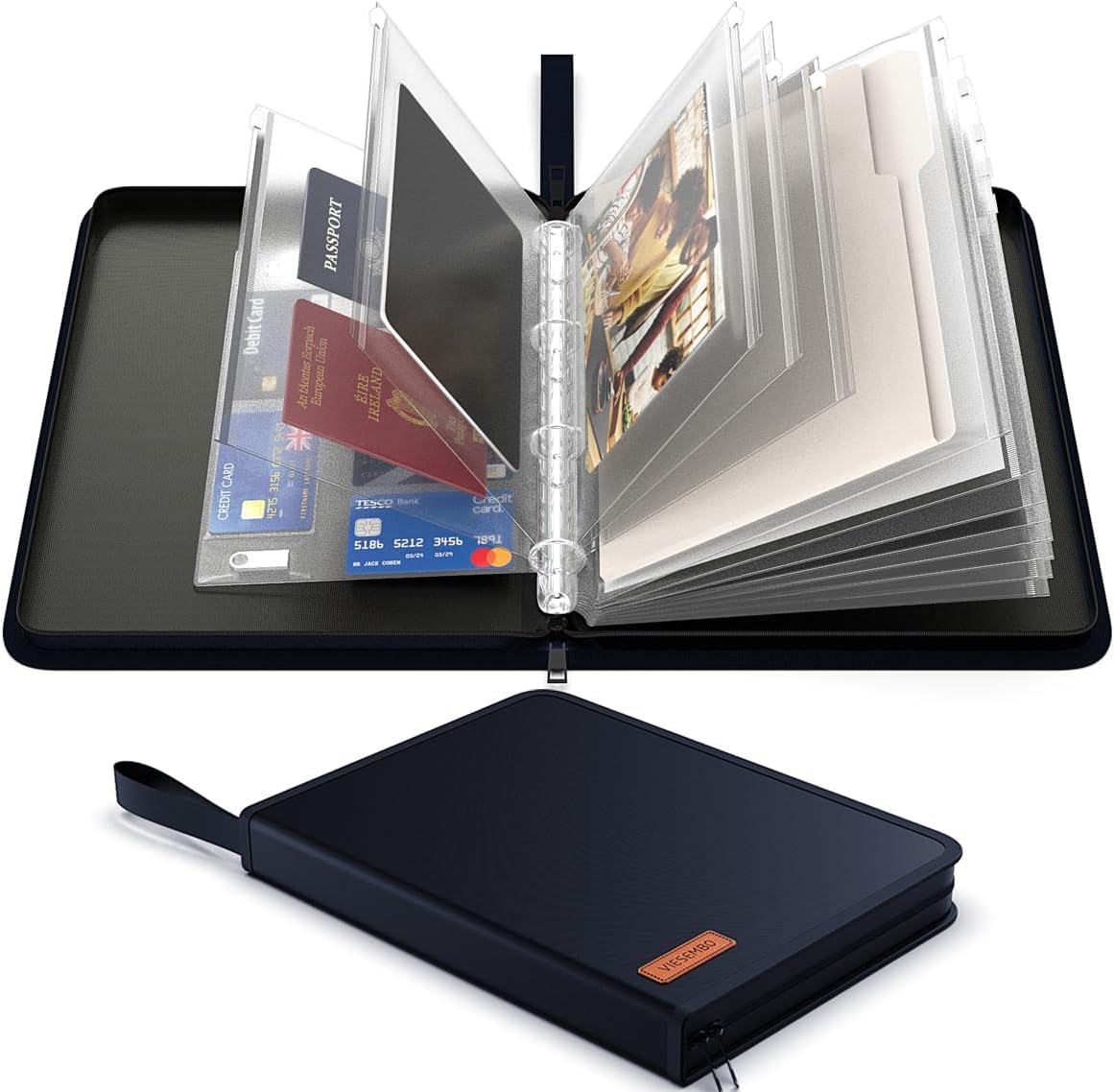 - Binder Pockets: The document holder includes 8 pcs A4 4-holes binder pockets, 4 pcs B5 binder pockets, 1 pcs card slot page holds 6 bank cards and USB