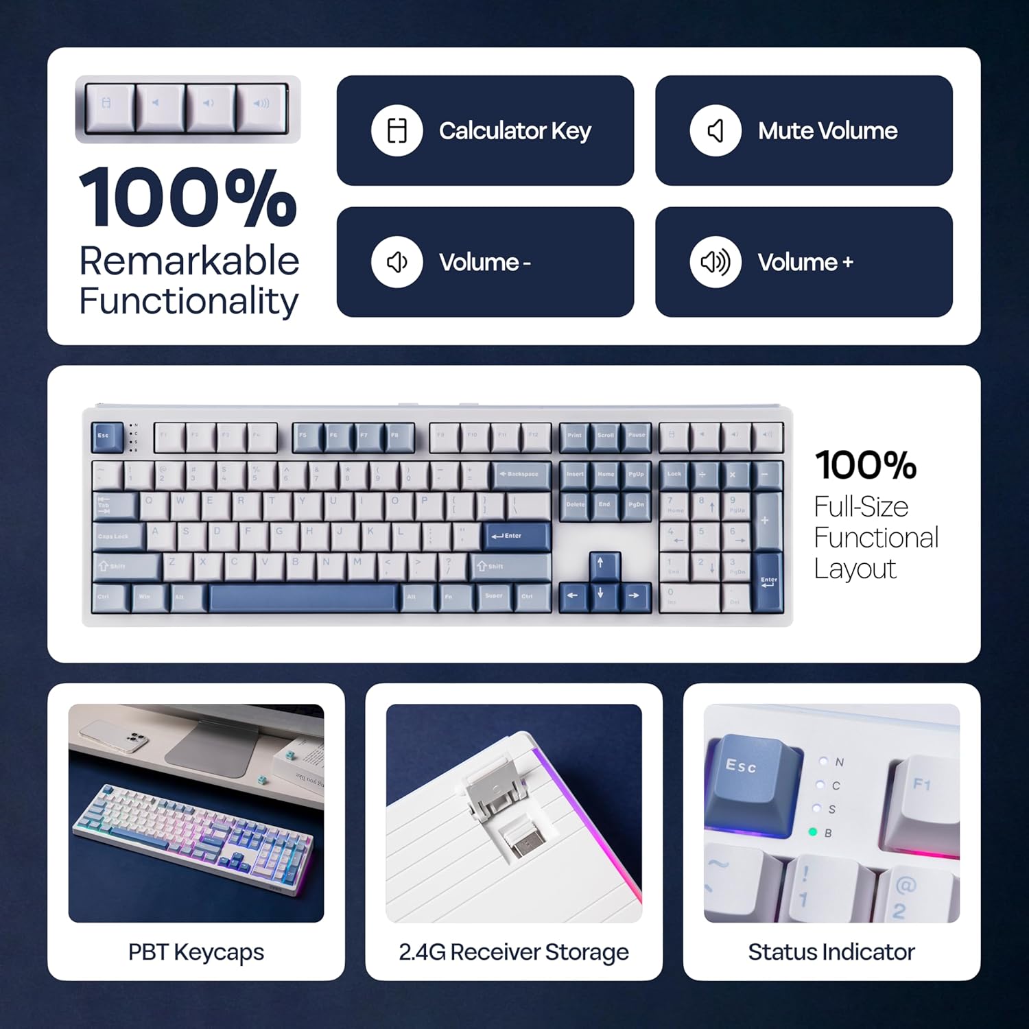 - Special Feature : 100% Full Size, Creamy Gasket-Mounted, Hot-Swappable, Long-Lasting 8000mAh Battery, Wireless Gaming Keyboard 100% Full Size, Creamy Gasket-Mounted, Hot-Swappable, Long-Lasting 8000mAh Battery, Wireless Gaming Keyboard