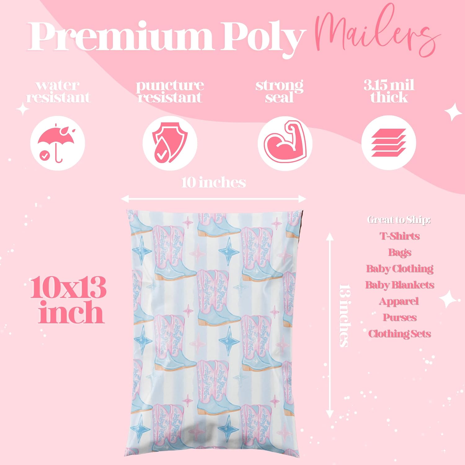 6x9 Designer Poly Mailer 100 Pack Heavy Duty Waterproof Self Seal Shipping Bags for Small Business Large Mailing Envelopes Bulk Tear Resistant Packaging Cowgirl Boots Western