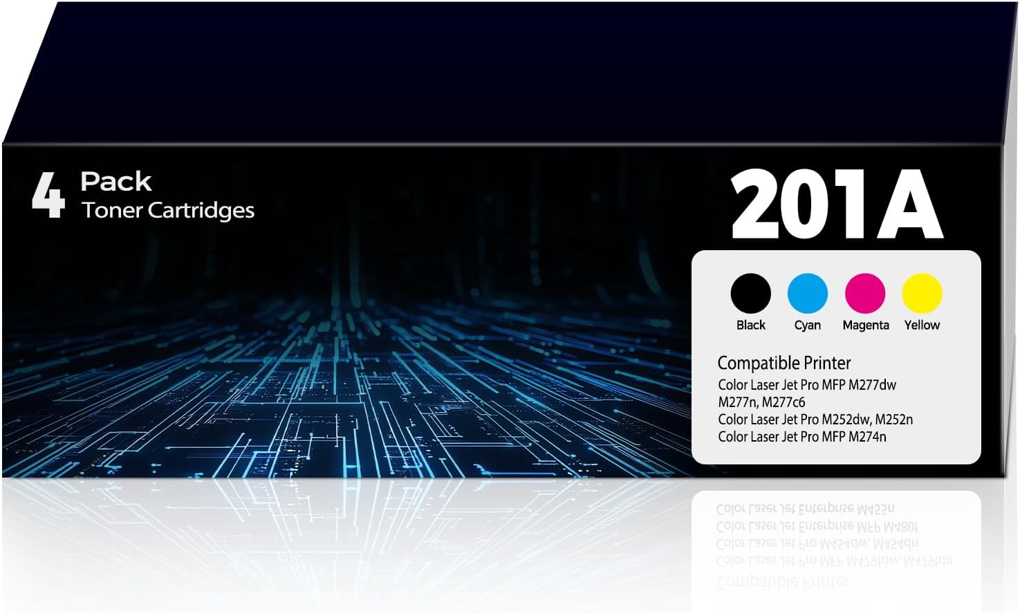 - Package Content: 4 Pack 201A toner including 1 x 201A black toner cartridge, 1 x 201A cyan toner cartridge, 1 x 201A magenta toner cartridge, 1 x 201A yellow cartridge.