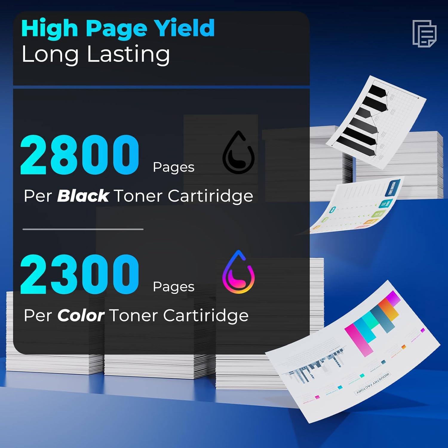- High Page Yield: 2,800 pages for 201X black toner cartridge (CF400X), 2,300 pages for per 201X color toner cartridges (201X Cyan CF401X, 201X Magenta CF402X, 201X Yellow CF403X) at 5% coverage (Letter/A4).