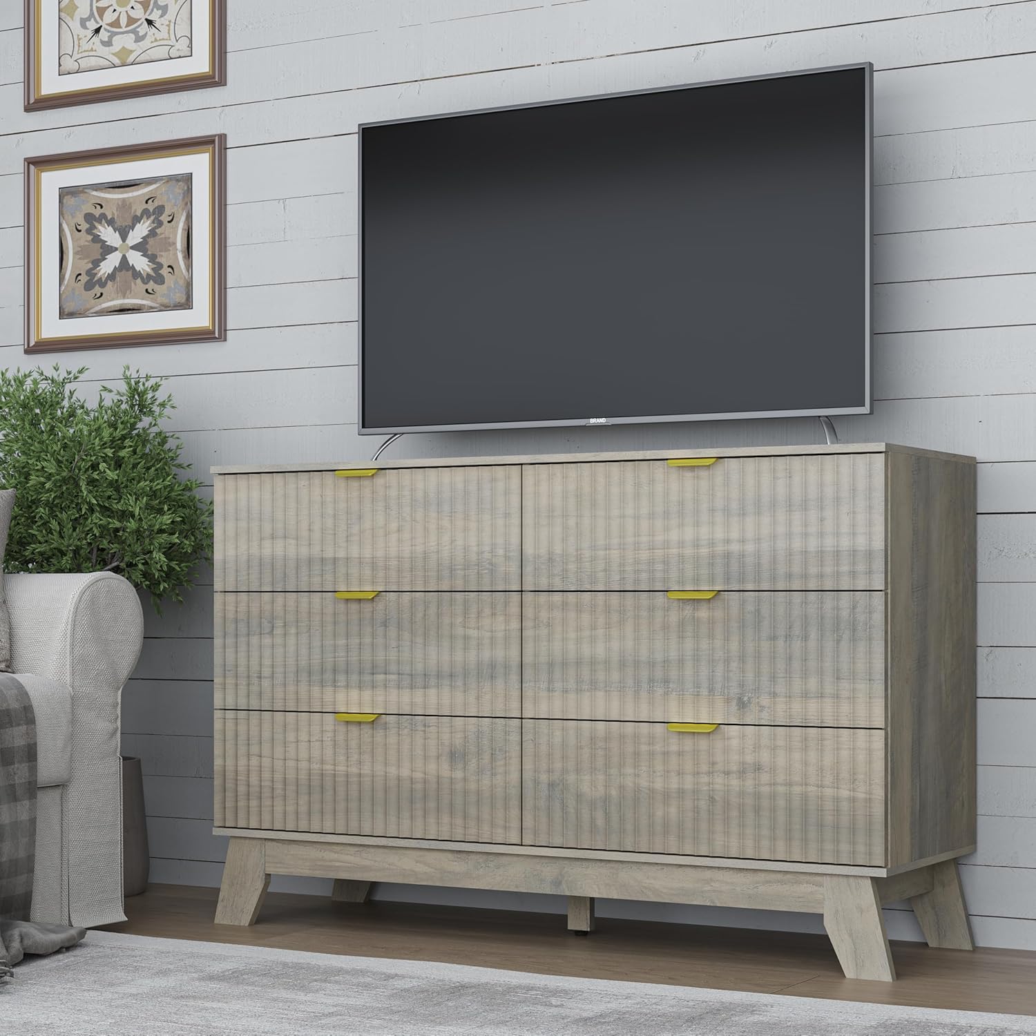 Fluted 6 Drawer Dresser, 47.2" Wide Modern Boho Chest of Drawers, Wooden Storage Dresser TV Stand for Bedroom, Living Room, Closet, Hallway, Curved Profile Design