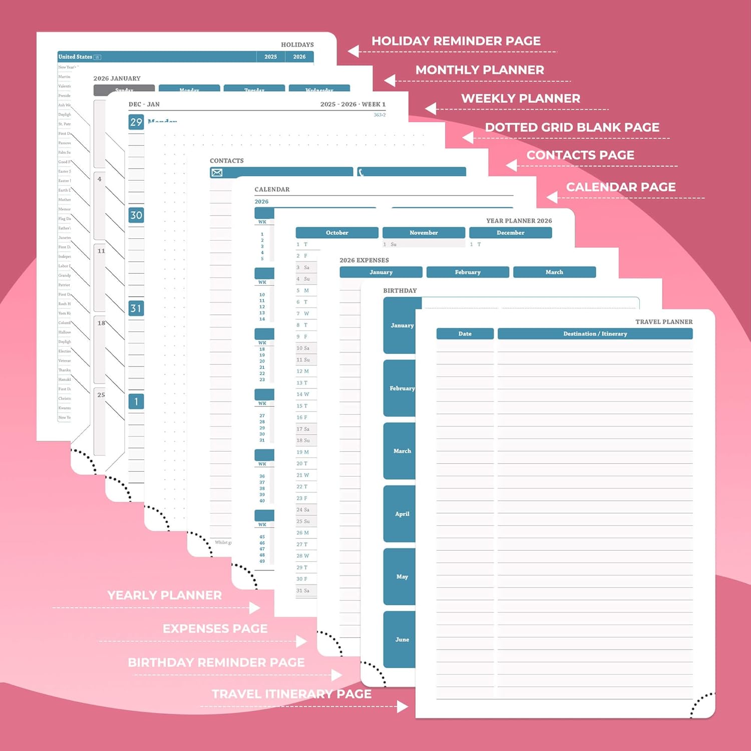 - Universal Design Planner: Suitable for a variety of people and scenarios. Professionals manage project progress, meeting arrangements and goals; student planner 2026 courses, exams and extracurricular activities; home users arrange travel, activitie