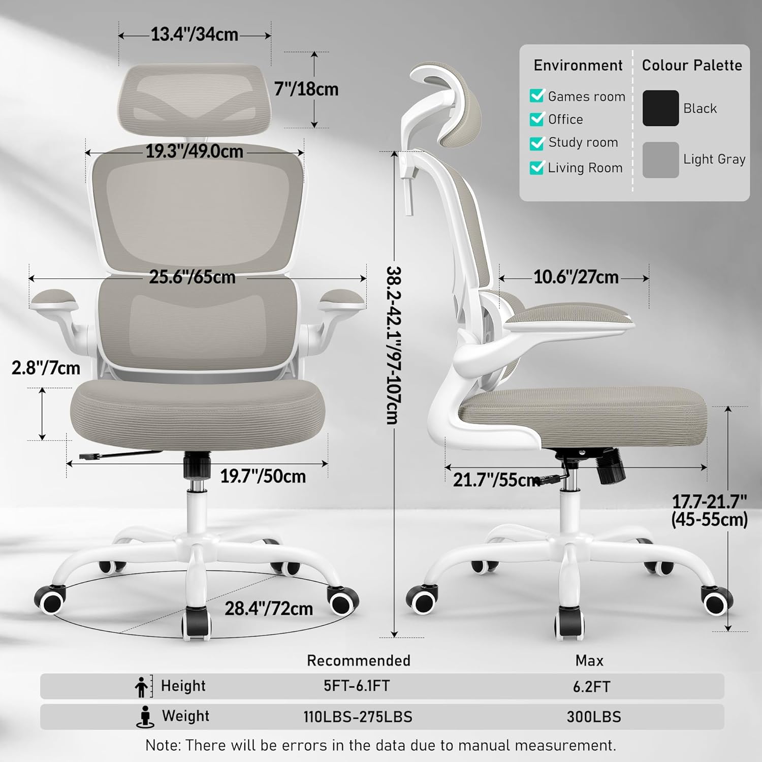 - 【Space-Saving Flip-Up Armrests】Designed with flip-up armrests, this office chair allows you to easily fold the padded arms up to 90° for space-saving convenience. Push the desk chair under your desk to free up valuable floor space. This versatile chair is ideal for use in home offices, meeting rooms, and gaming setups, with a stylish Light Gray color that suits any environment.