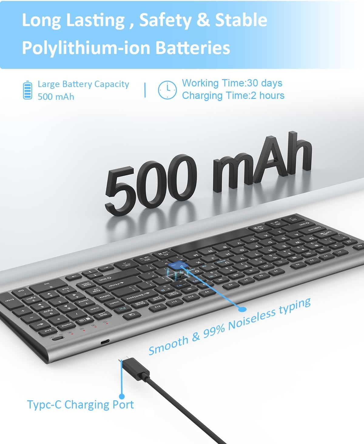 - Special Feature : 3 Bluetooth + 2.4G USB for multi devices, Compact full-size 121 keys 10% shorter, Compatible with Android/iOS/macOS/Windows systems, Ergonomic Silent Slim, Rechargeable USB C 3 Bluetooth + 2.4G USB for multi devices, Compact full-size 121 keys 10% shorter, Compatible with Android/iOS/macOS/Windows systems, Ergonom… See more
