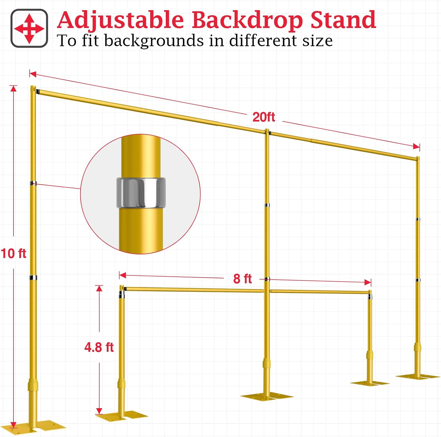 - 【Sturdy Photo Background Stand】10x20 ft /3x6 m heavy duty backdrop stand. Aluminum and steel framework provides maximum stability and professional durability,Sturdy base legs provide sturdy balanced support for safety and reliability