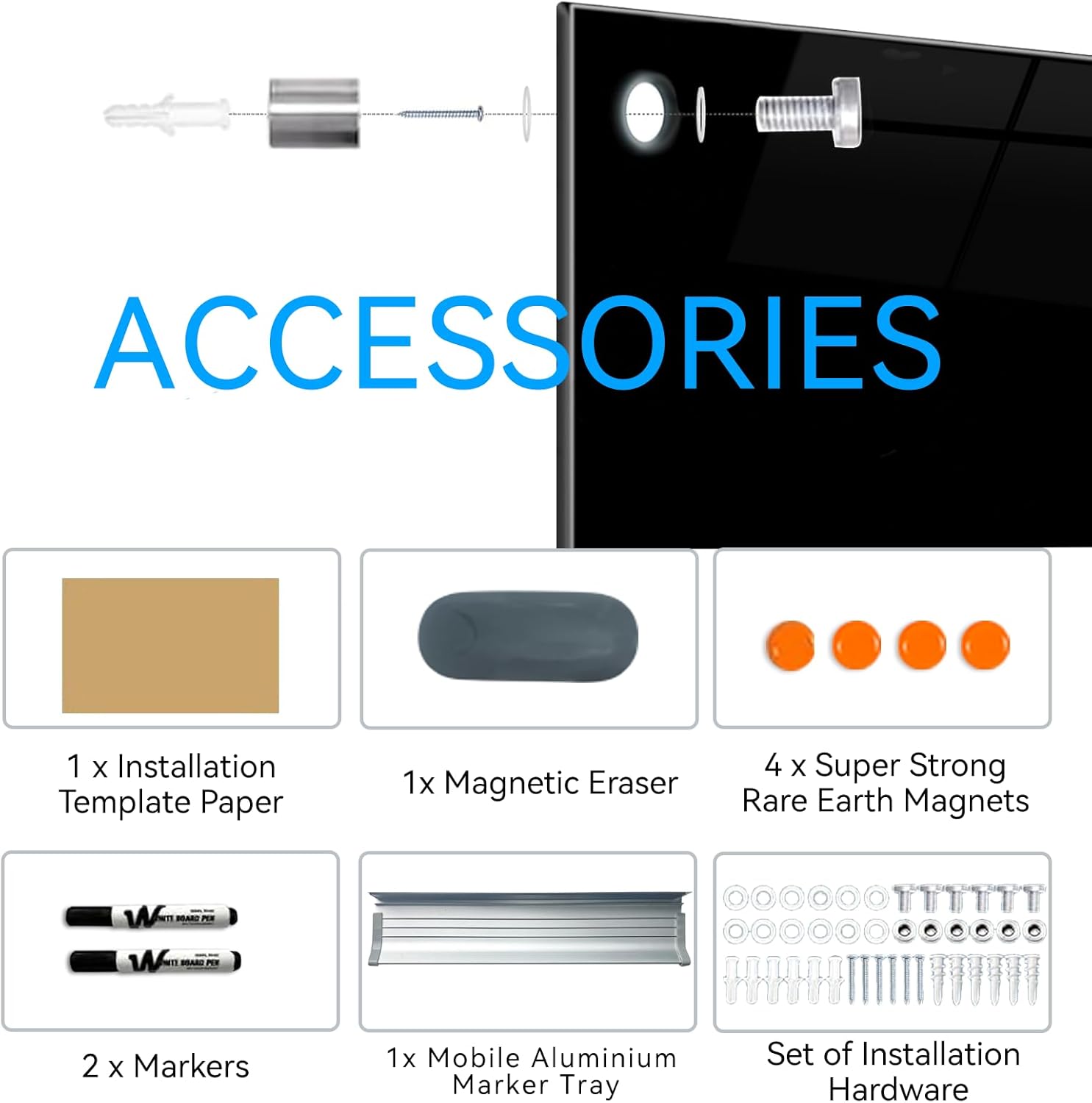 - Easy To Install: Using our wall mounting kit (including a set of mounting accessories and a mounting template paper) and assembly instructions, you can easily hang the glass black dry erase board on the wall. You can also secure the board vertically or horizontally, providing flexibility to fit your specific space and needs