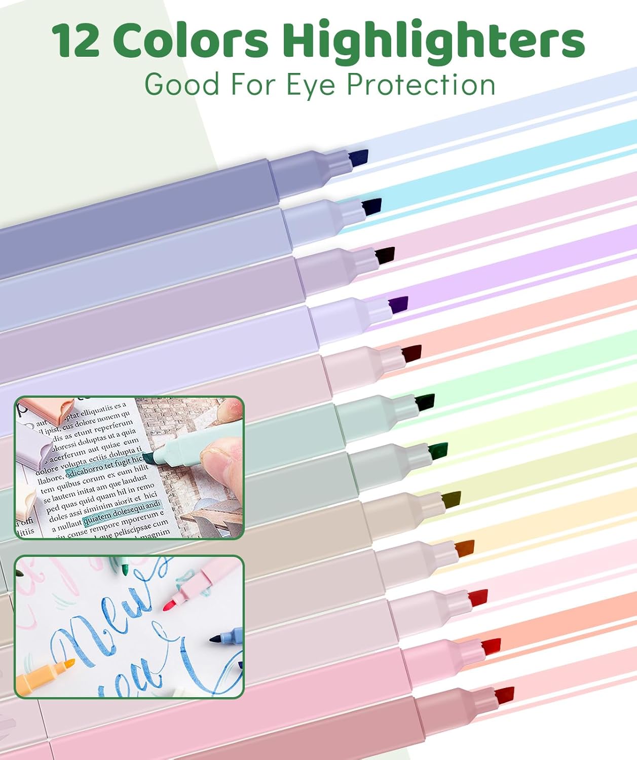 - 12 Assorted Colors Highlighters: The 12 highlighters in this set have flat-shaped barrels and chisel tips, making them easy to hold and ideal for both broad highlighting and fine underlining. The versatile chisel tip makes it simple to switch between fine and bold strokes; The long-lasting, not easy to bleed ink keeps pages crisp and clear