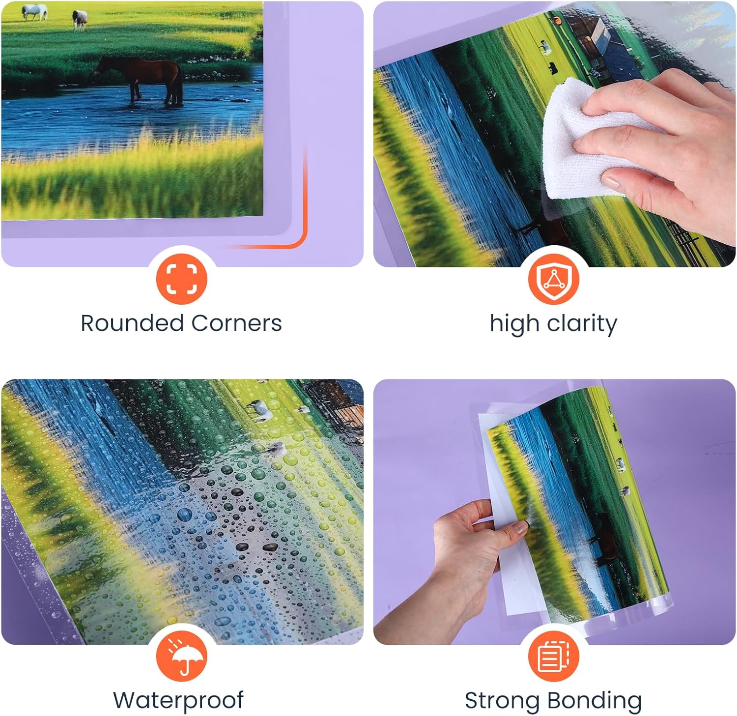- Premium Material: Crystal clear, glossy sheen, sturdy and Premium material. Laceration resistant, double coating, anti-stain, sturdy and waterproof, protect your document from scratching
