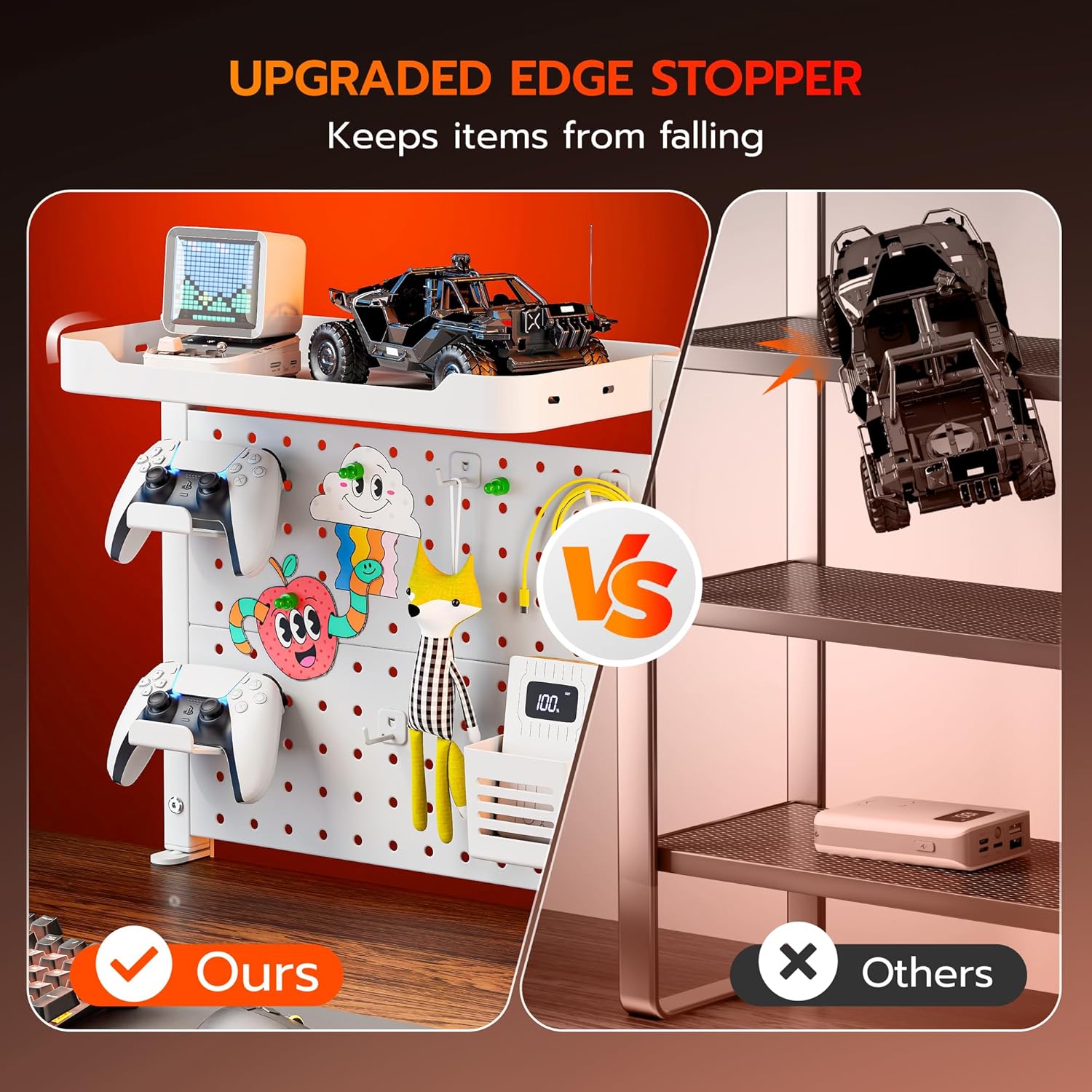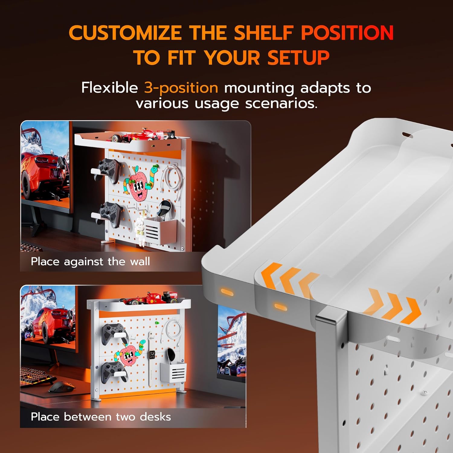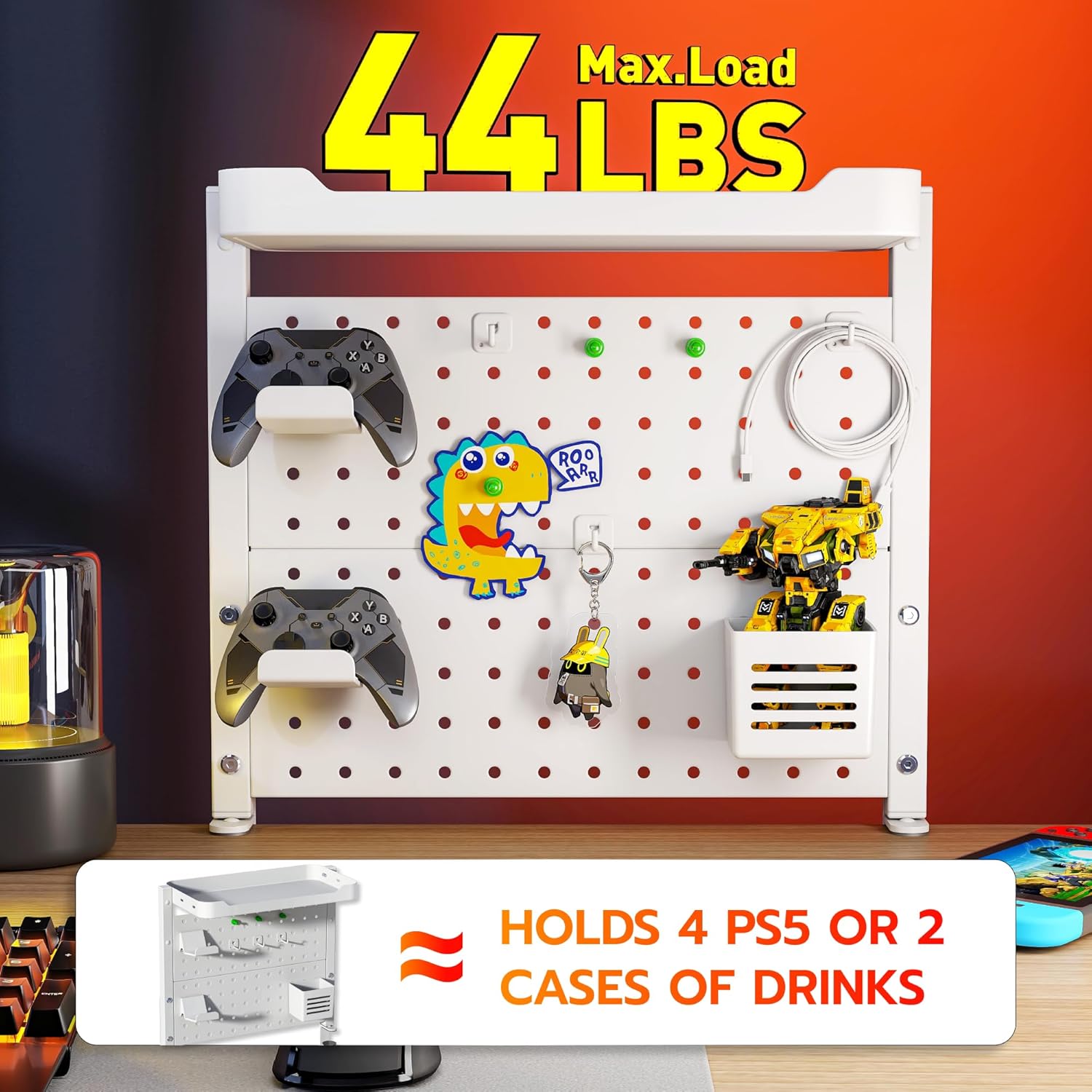 - 【Customizable with Accessories】This peg board shelf offers unparalleled flexibility with its edge-mounted design, supporting both above and under desk configurations. Use the above-desk setup for easy access to frequently used daily items, or opt for the under-desk installation to store cables, chargers, or hidden peripherals discreetly. It includes 2 controller holders, 1 pen holder, 3 magnets, and 3 hooks, allow you to fully customize the setup to suit your specific needs.