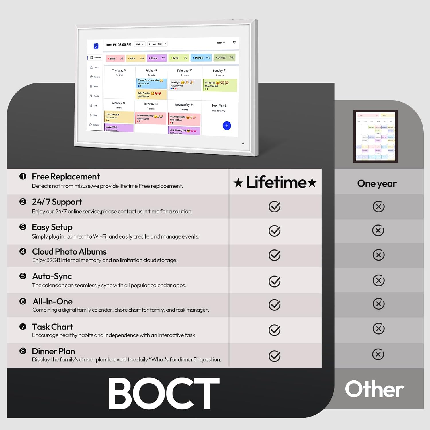 - [Lifetime Warranty & Support] Get a free replacement for any BOCT digital calendar quality issues, plus lifetime technical support and accessories. Contact us anytime for help.