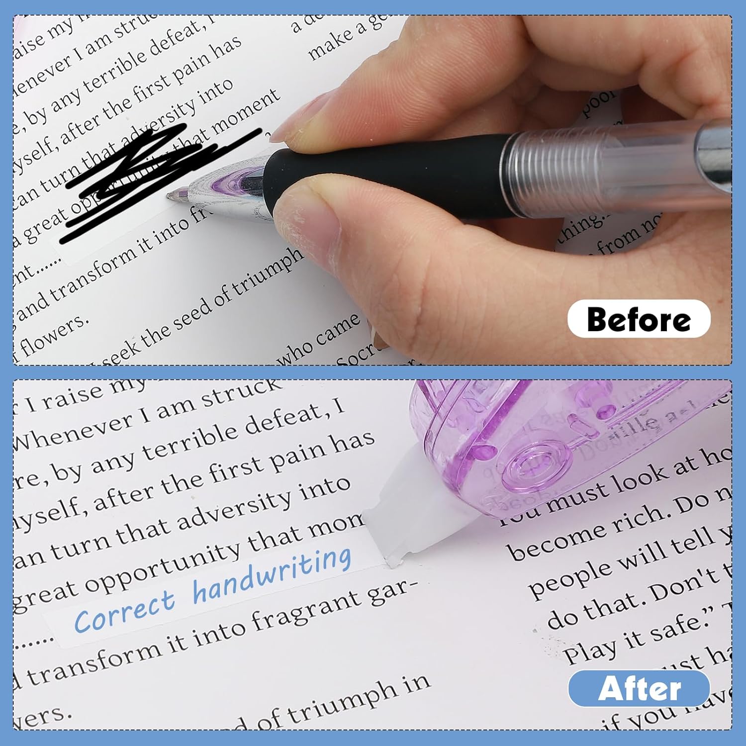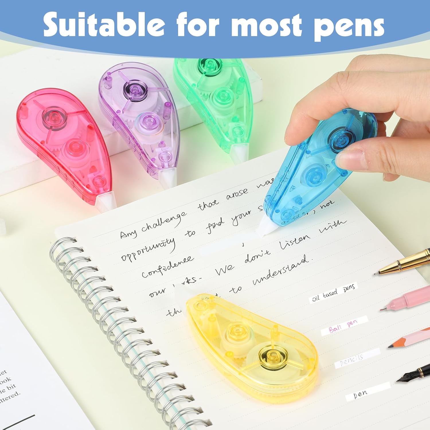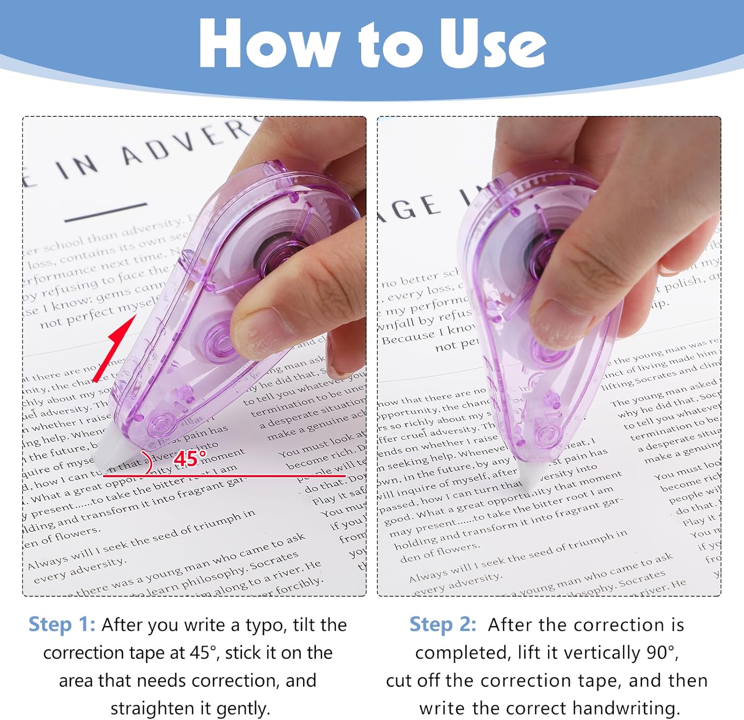 - Easy to Operate: In daily use, when you make a typo, tilt the correction tape at 45°, stick it on the area that needs correction, and straighten it gently. After the correction is completed, lift the correction tape vertically 90°and it will automatically break, and then write the correct text.
