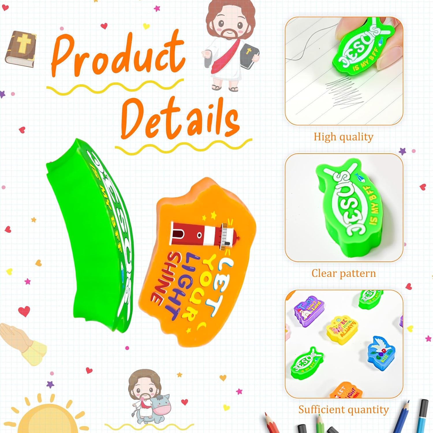 - Bright Colors & Kid-Friendly Designs:Featuring a mix of bright colors and faith-themed illustrations like crosses, hearts, and doves, these erasers are visually appealing and great for motivating children to enjoy learning