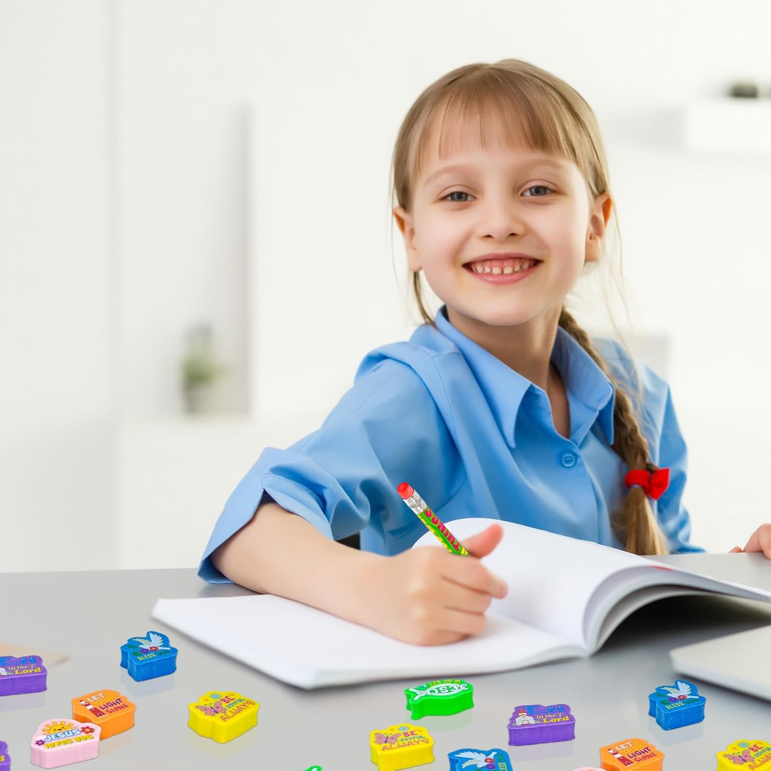 - Uplifting Scripture Messages:Each eraser is printed with an encouraging Bible verse or Christian message, such as “God is Love,” “Trust in the Lord,” and “Be Strong & Courageous.” Great for reminding kids of faith and positivity throughout the day