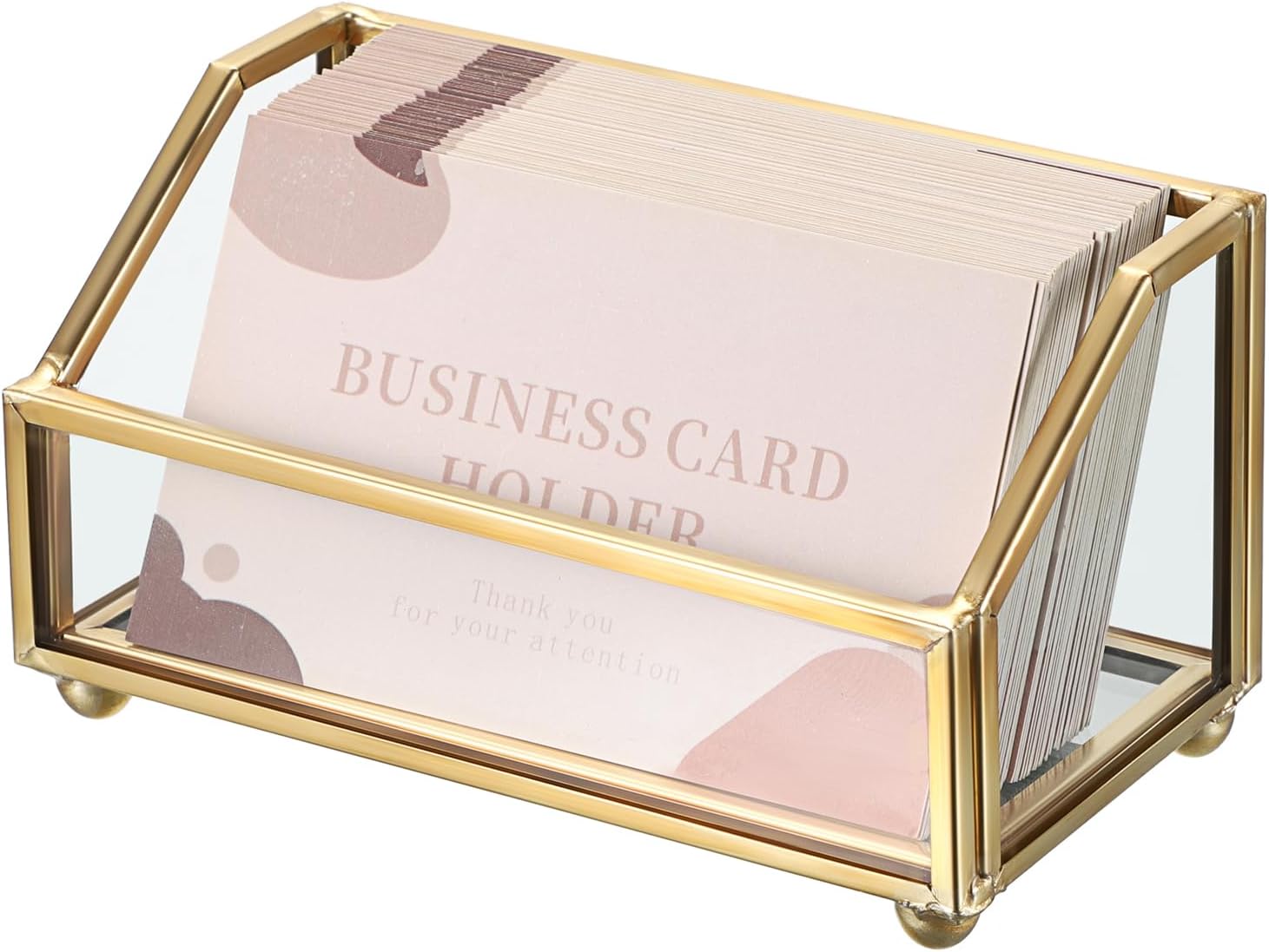 - High-quality Material: This business card stand made of premium metal and sleek glass. The frame is carefully finished with beautiful gold color, well painted. And with the high translucent glass, business cards are clearly visible