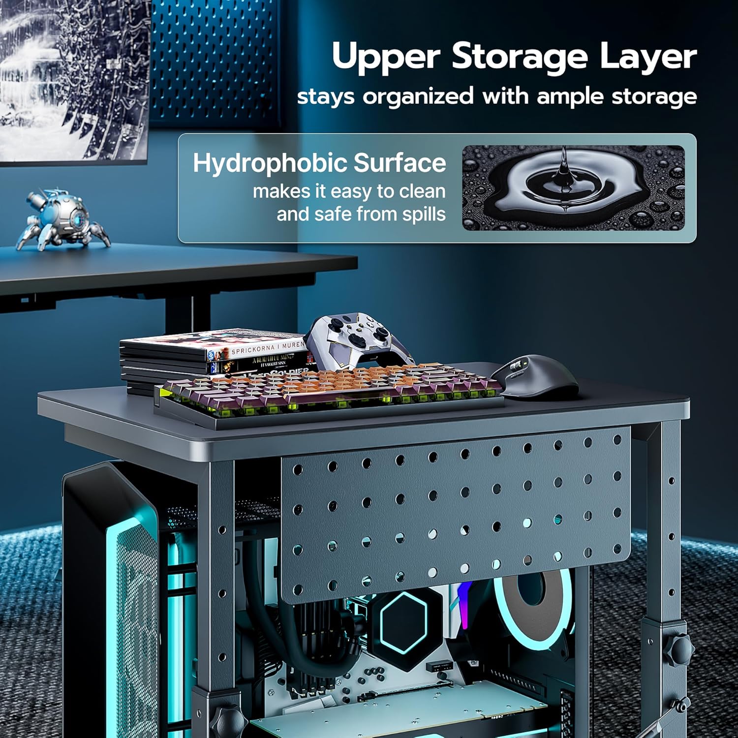- 【Expanded Storage with Pegboard】The 2-tier PC floor stand can expand your tabletop and storage space, keeping your whole setup organized, not just the PC. The top shelf can hold printers, plants, documents, and magazines. The metal pegboard organization area can hang headphones, power strips, and other accessories from it. The CPU holder comes with an extra-long mouse pad, so the entire upper shelf can be used not only as an area to use your mouse on but also as a pet resting area