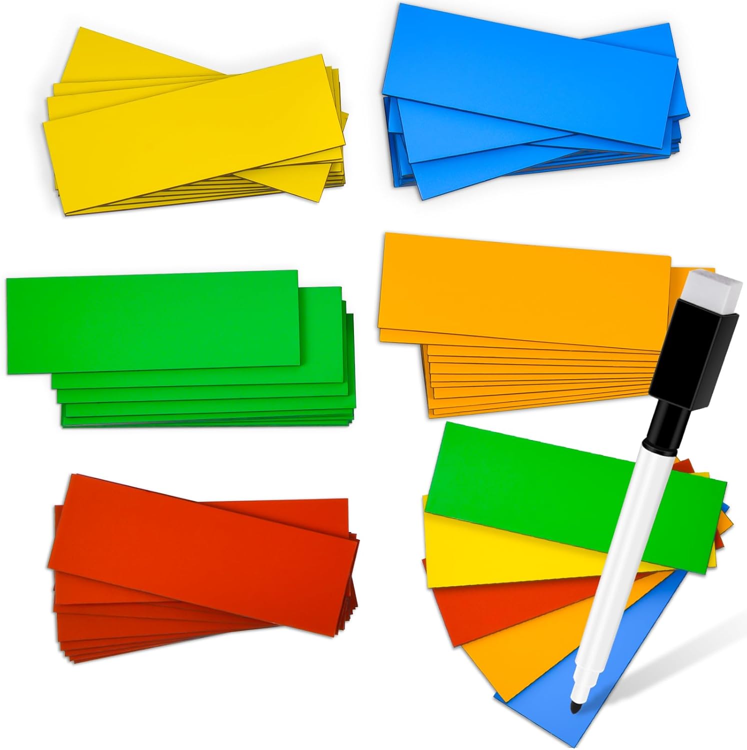 - 【Extra Thick Size】50 magnetic dry erase labels (10 per color, 5 colors) are 0.06 inches thick, more thicker and more resilient than other magnet label on the market. Dimensions: 6 x 2 cm (2.4" x 0.8") The 5 colors of magnetic labels are yellow, blue, green, orange, and red. These colorful dry erase magnets labels are available in 5 stylish and adorable colors