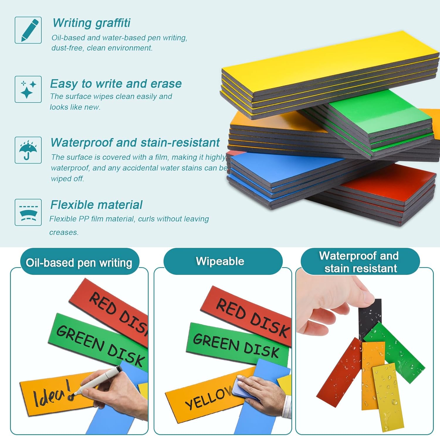 - 【Easy Clean and Reusable】These colorful magnetic labels are made with PET dry-erase film and can be written with the included whiteboard pen. The writing on the dry erase sticky notes is easily wiped clean and reusable. The magnetic name tags are easy to remove and leave no marks when not in use