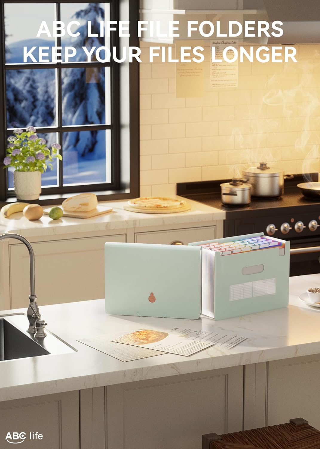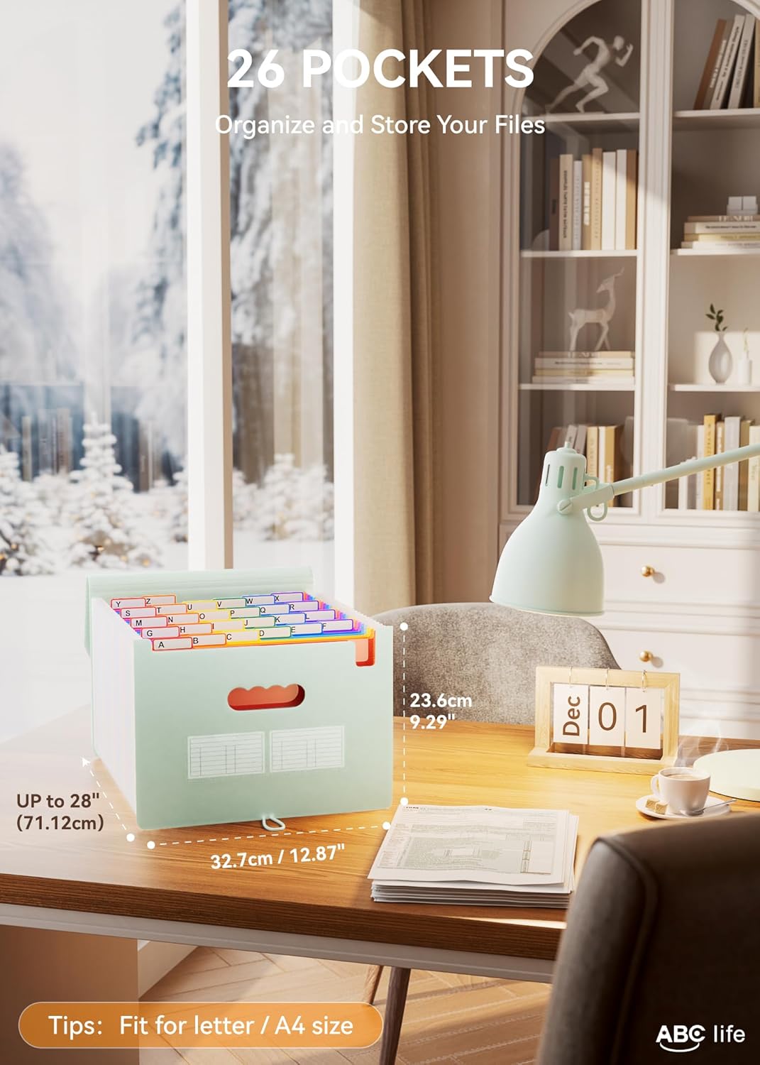 - 26 Expanding File Folder: ABC life pockets accordian file organizer suitable for filing tax and storing important family documents. Product size is 13 "x 9.4"x 28", top and bottom are both expandable, For letter/A4 size files.