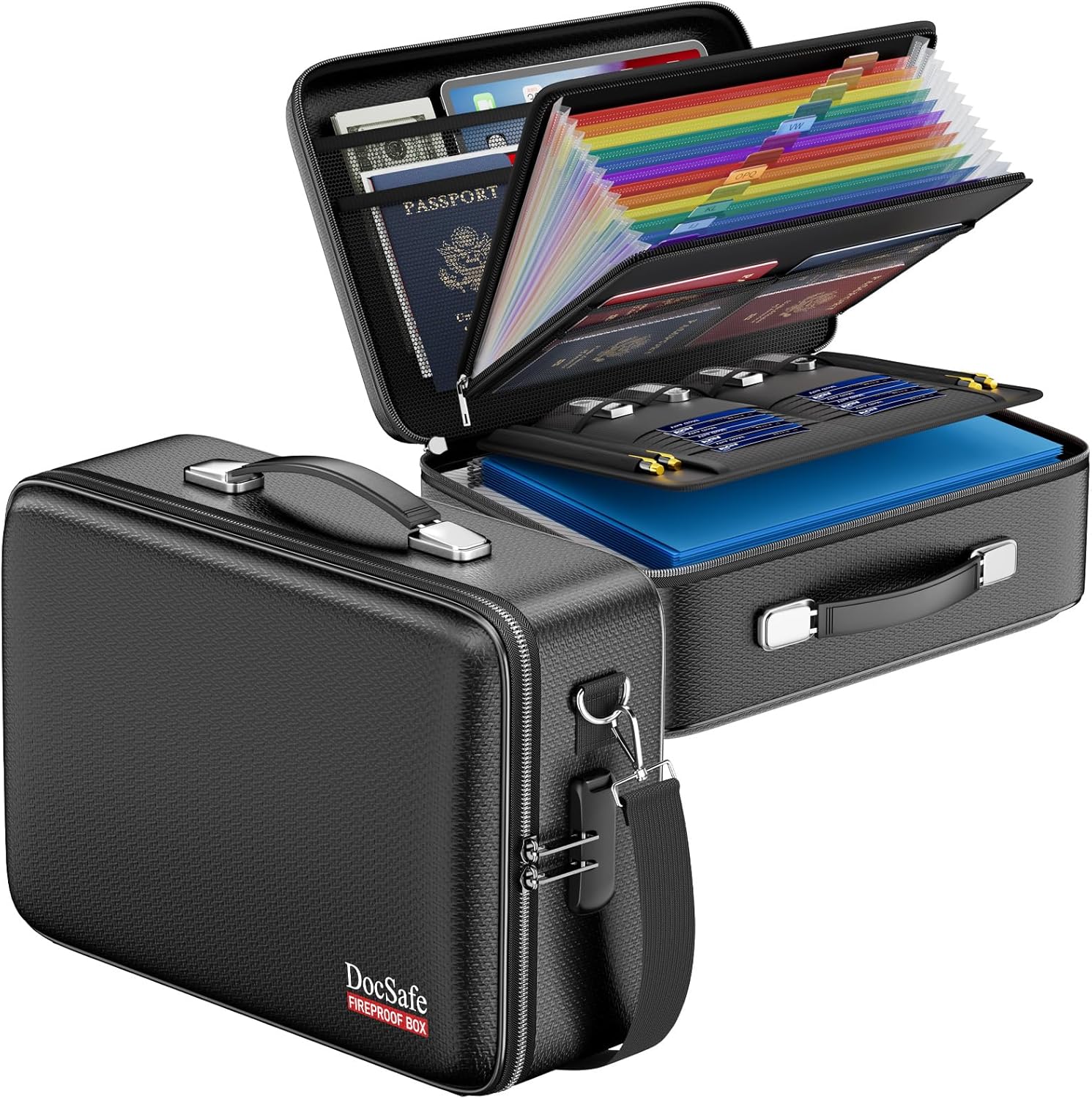 DocSafe Fireproof Document Box with Lock, Hard Case File Organizer with Accordion File Folder, Fireproof Water Resistant Safe Box Home Office Travel Storage for Important Documents Laptop Black