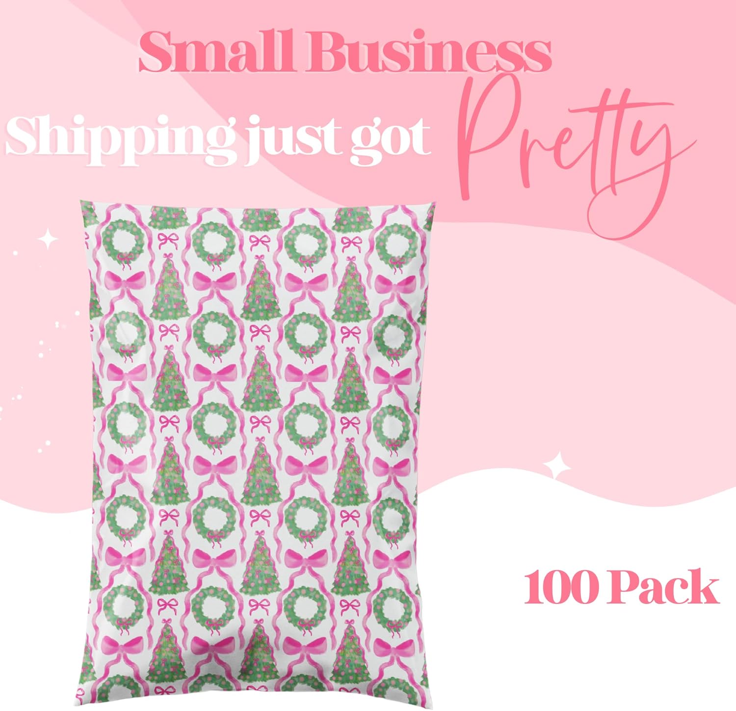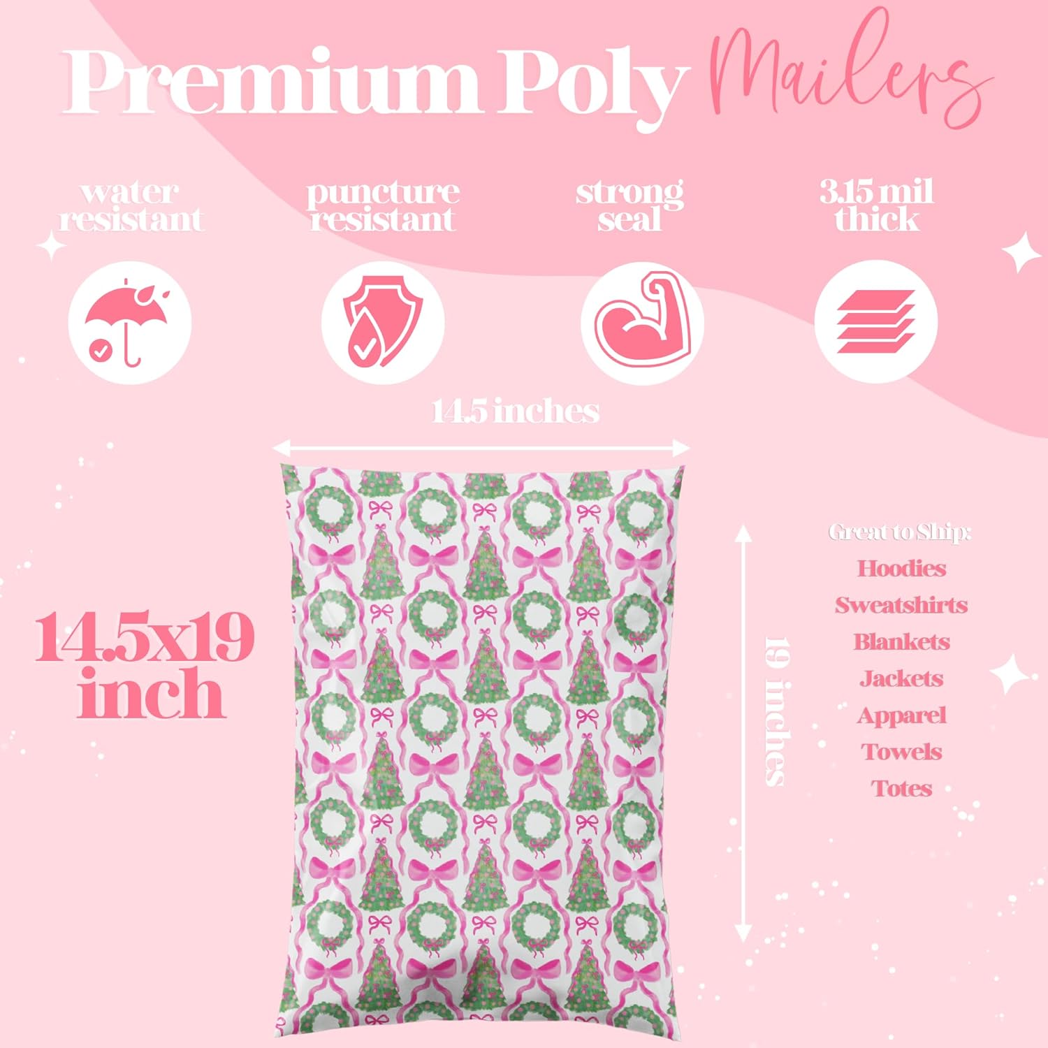 14.5x19 Designer Poly Mailer 100 Pack Heavy Duty Waterproof Self Seal Shipping Bags for Small Business Large Mailing Envelopes Bulk Tear Resistant Packaging Coquette Christmas Holiday Bows