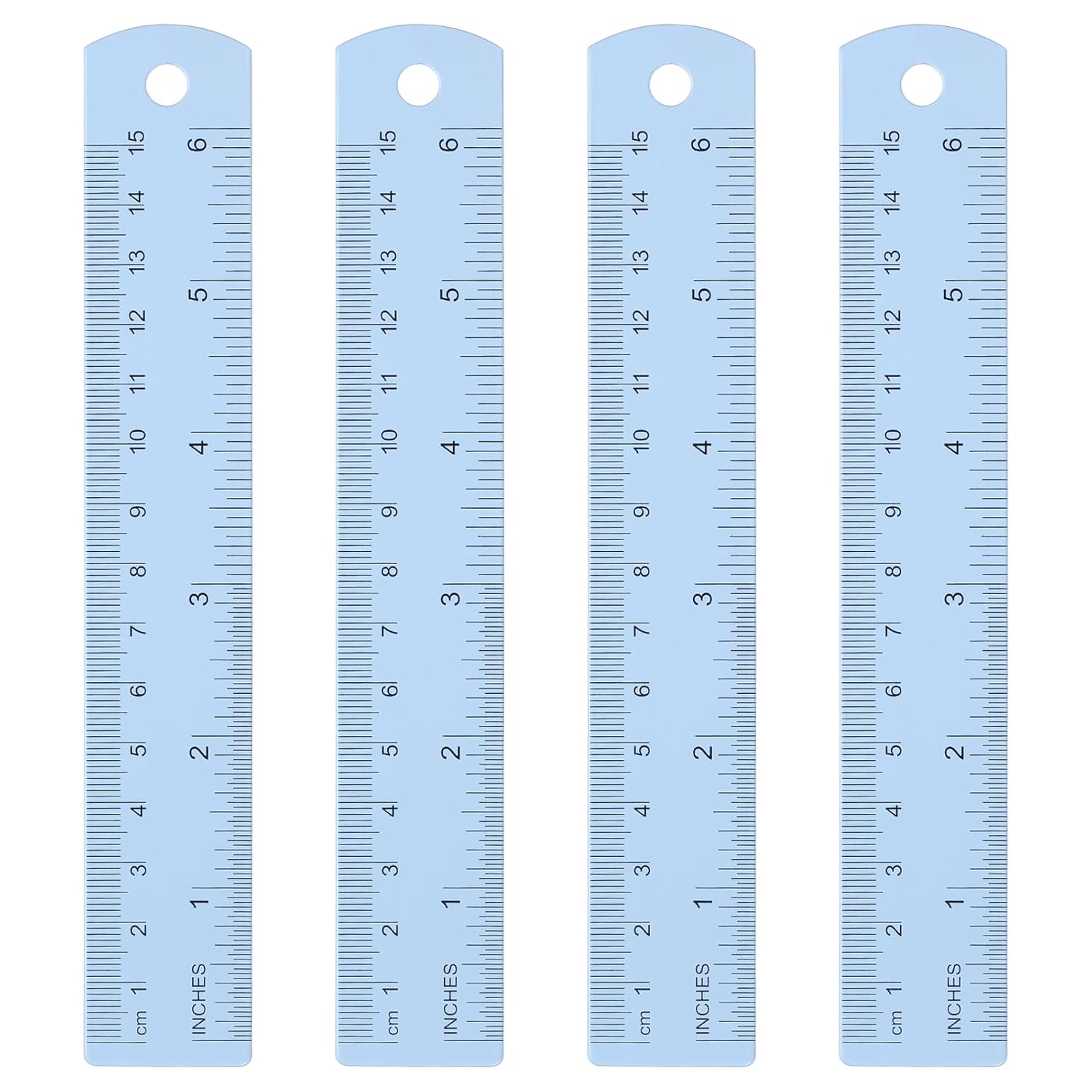 HARFINGTON 4pcs Metal Straight Ruler 15cm Metric SAE Aluminum Alloy Measuring Rulers Scale Tool with Hole for Measure Study Reading Classroom Office, Light Blue