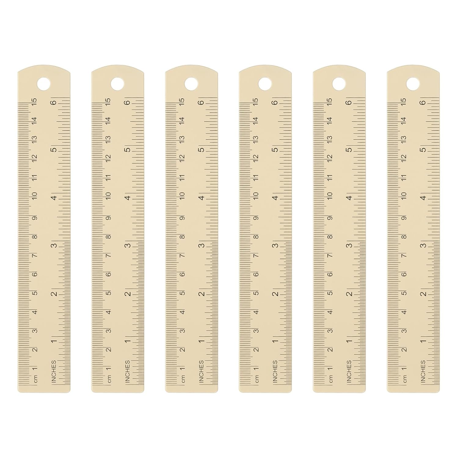HARFINGTON 6pcs Metal Straight Ruler 15cm Metric SAE Aluminum Alloy Measuring Rulers Scale Tool with Hole for Measure Study Reading Classroom Office, Beige