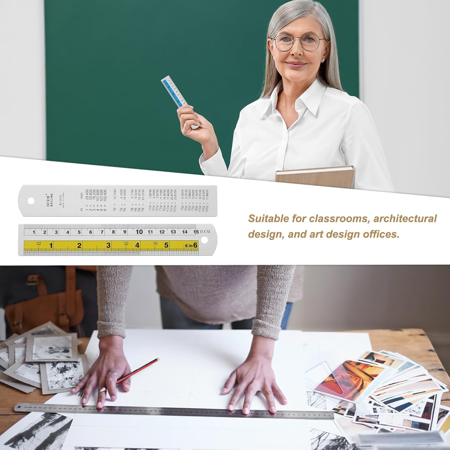 - Application - The dual-scale straight ruler is widely used in geometric drawing, plane drawing, composition planning, and mathematical chart drawing; it is suitable for classrooms, architectural design, art design office occasions, and other work environments that require precise measurement or drawing.