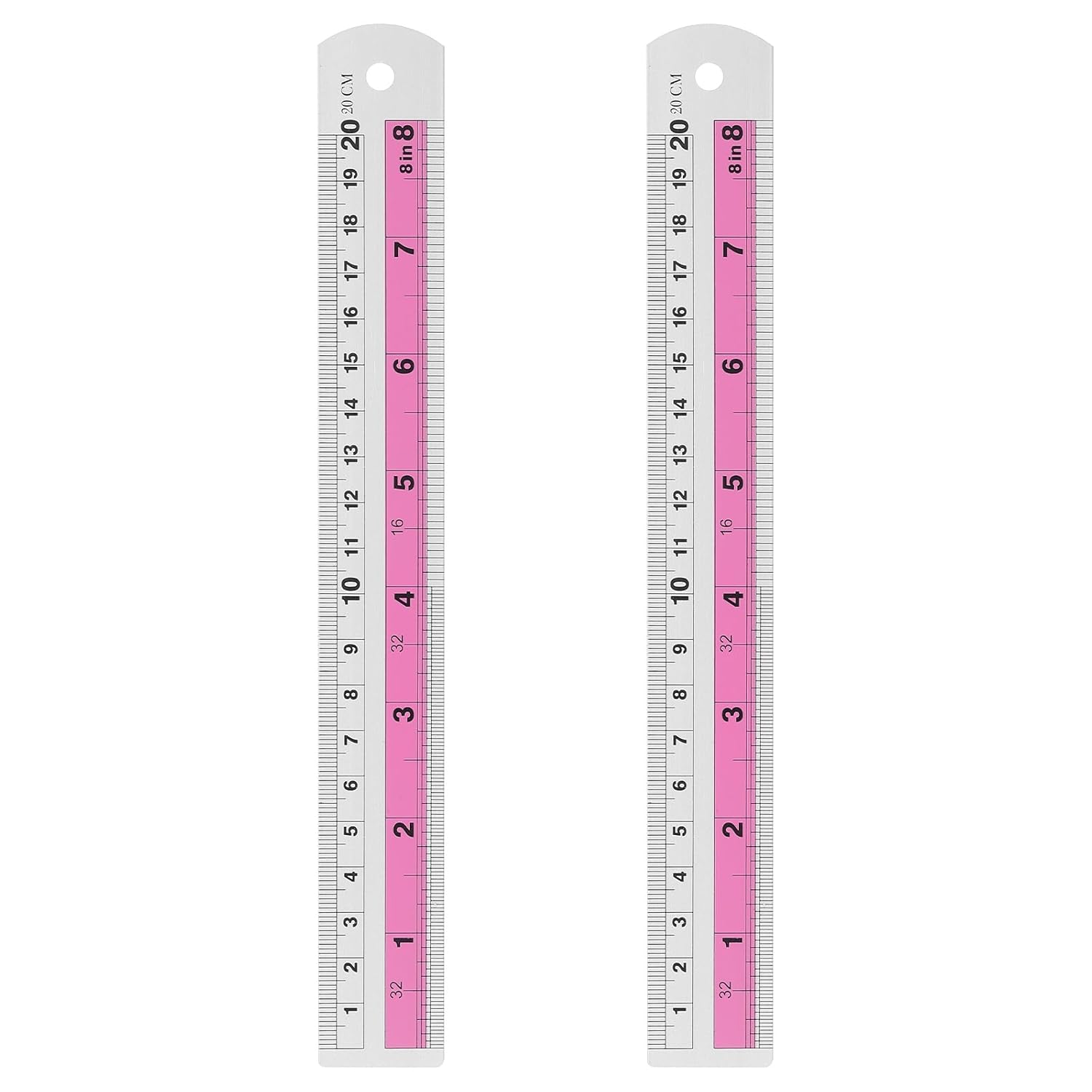 HARFINGTON 2pcs Metal Straight Ruler 20cm Metric SAE Aluminum Alloy Measuring Rulers Scale Tools with Hole for Measure Study Reading Classroom Office, Pink