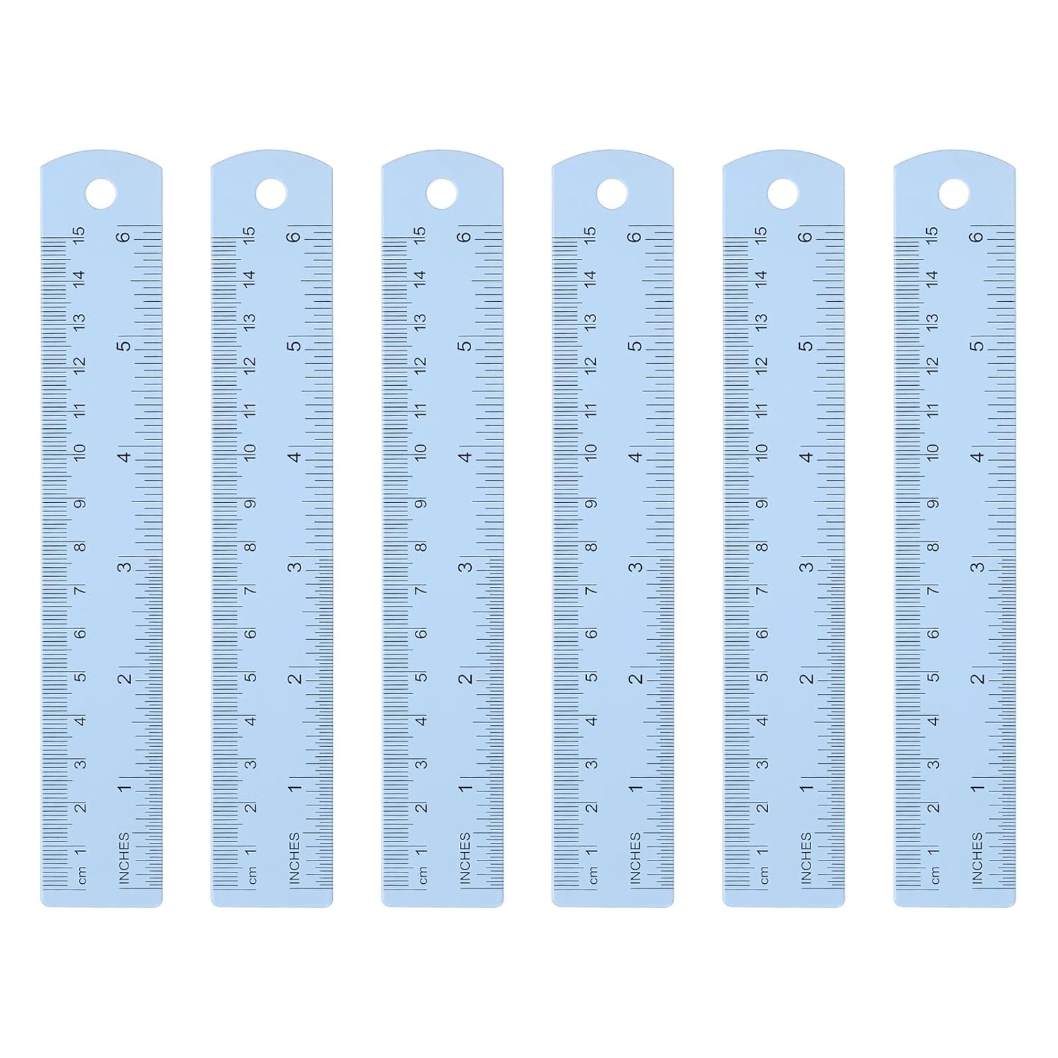 HARFINGTON 6pcs Metal Straight Ruler 15cm Metric SAE Aluminum Alloy Measuring Rulers Scale Tool with Hole for Measure Study Reading Classroom Office, Light Blue