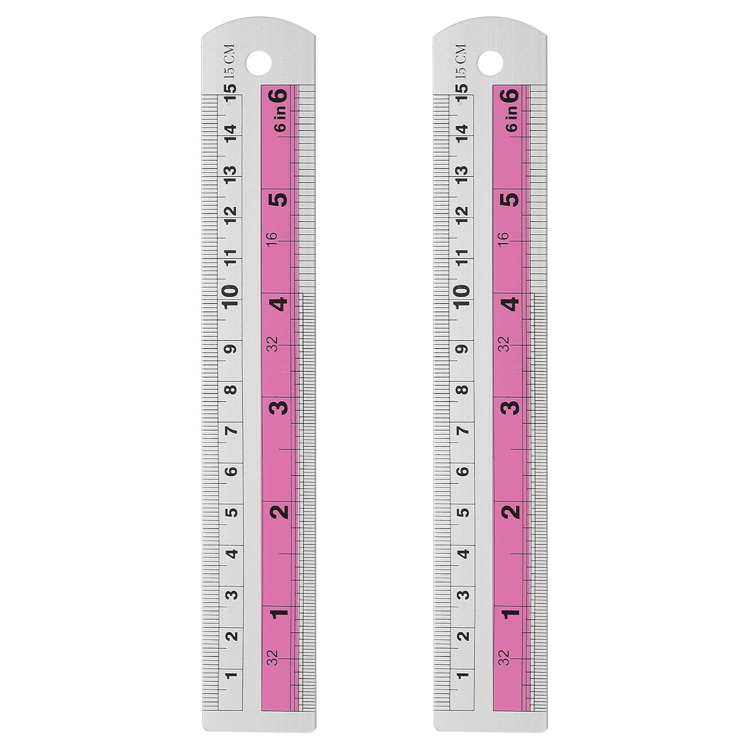 HARFINGTON 2pcs Metal Straight Ruler 15cm Metric SAE Aluminum Alloy Measuring Rulers Scale Tools with Hole for Measure Study Reading Classroom Office, Pink