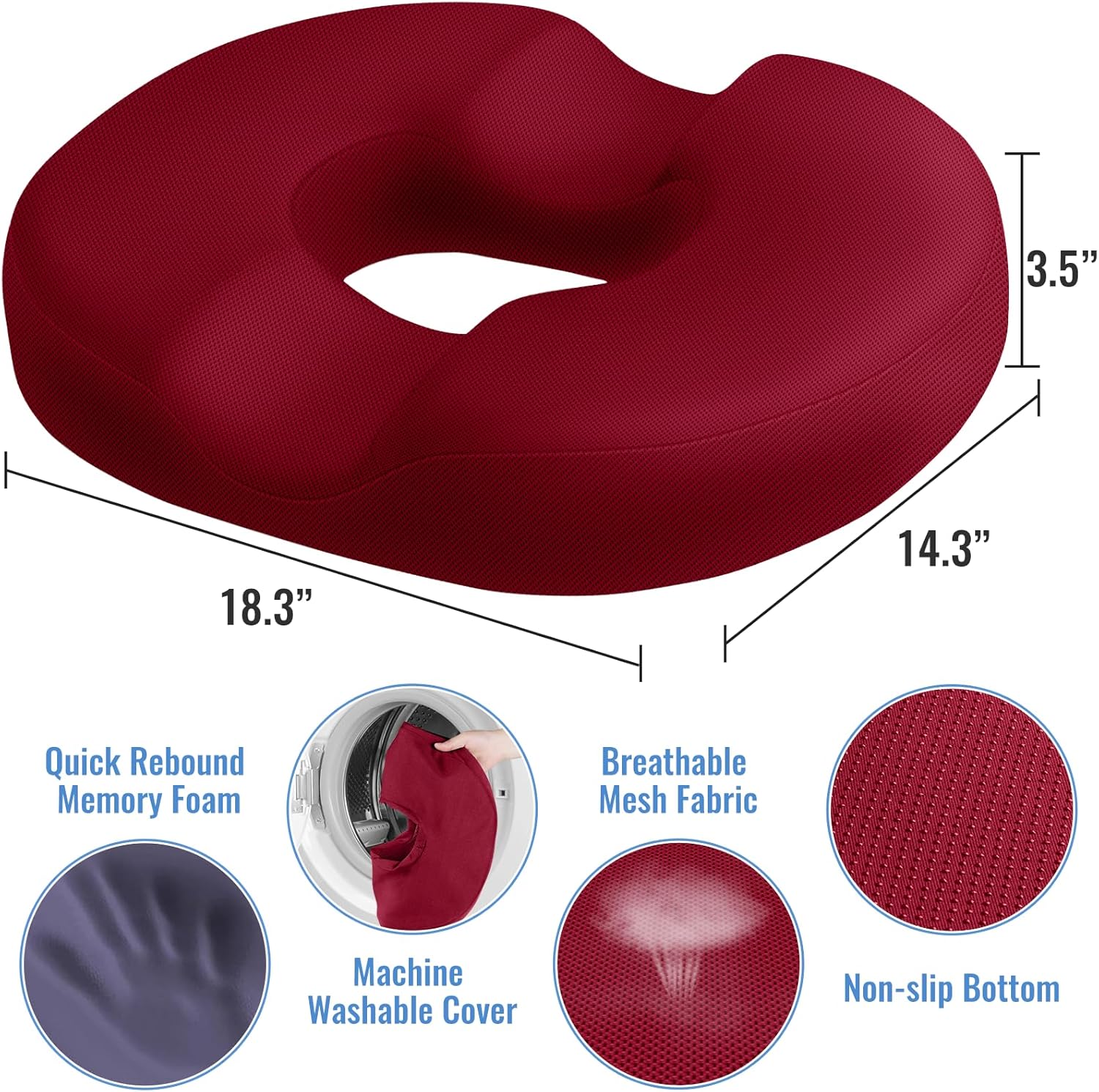 - Suitable Size: CloudBliss donut pillow measures 18.3" x 14.3" x 3.5". The donut pillow can be taken anywhere, and can be used for any type of chair, such as wheelchair, office chair, airplane, car, bleachers at games, dining chair, etc. Its portable and lightweight design allows you to take it with you wherever you go, ensuring you never have to compromise on your comfort