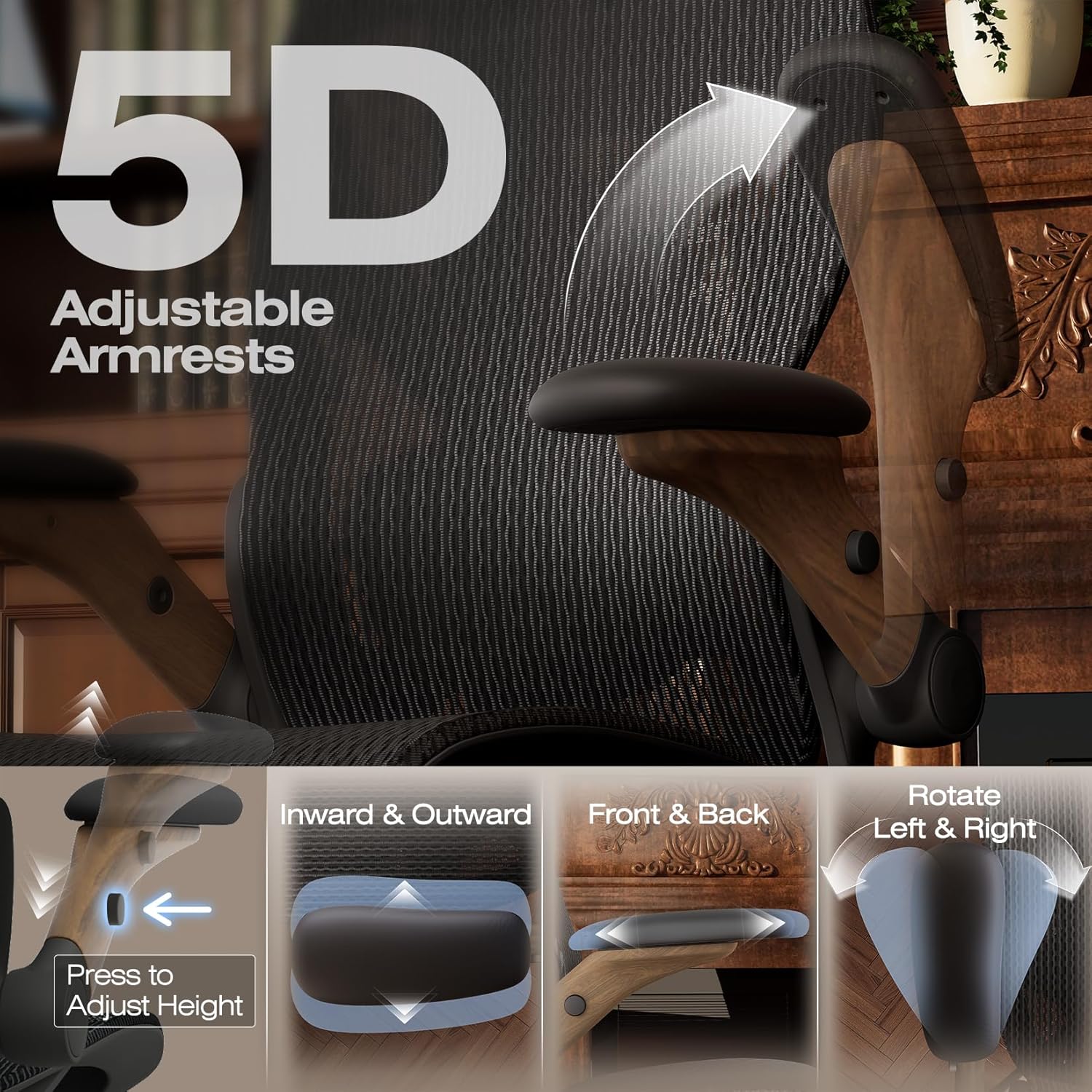 - 【Smart Space-Saving Features】 5D Flip-Up Armrests with skin-friendly panels - 27% denser EVA foam padding achieves Zero-Pressure Contact, it can be adjusted at Height/width/forward/backward/rotate/flip function, a space-saving flip-up design that tucks neatly under standard desks