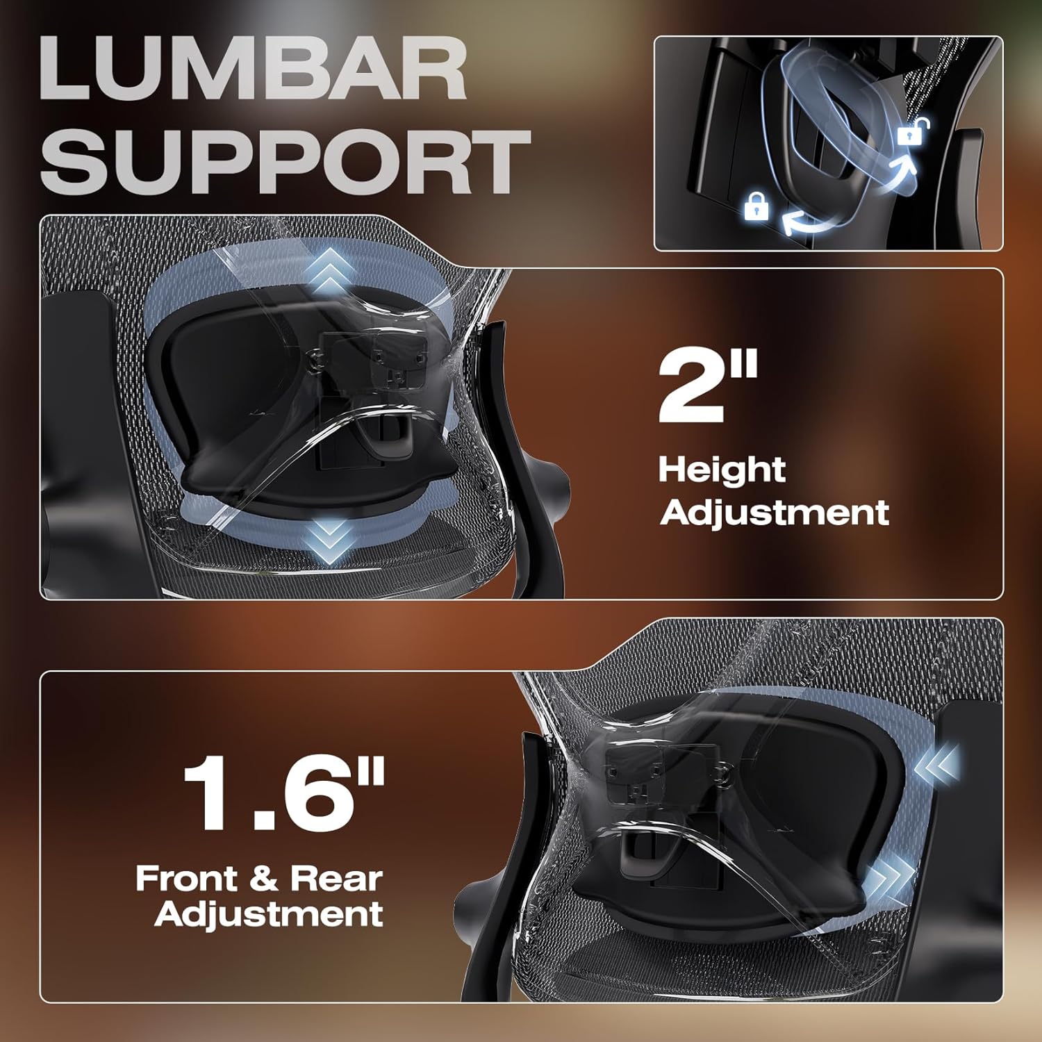 - 【Engineered with Dynamic Spinal Alignment System】3D Synchro-Tilt Lumbar(Lockable ±1.6" depth spring-loaded auto-tracking/±2" height/15° rotation)with force-sensitive springs mimics natural spine curvature, certified by AEP* for 12hrs+ fatigue reduction in ergonomic chairs (*American Ergonomics Partnership)