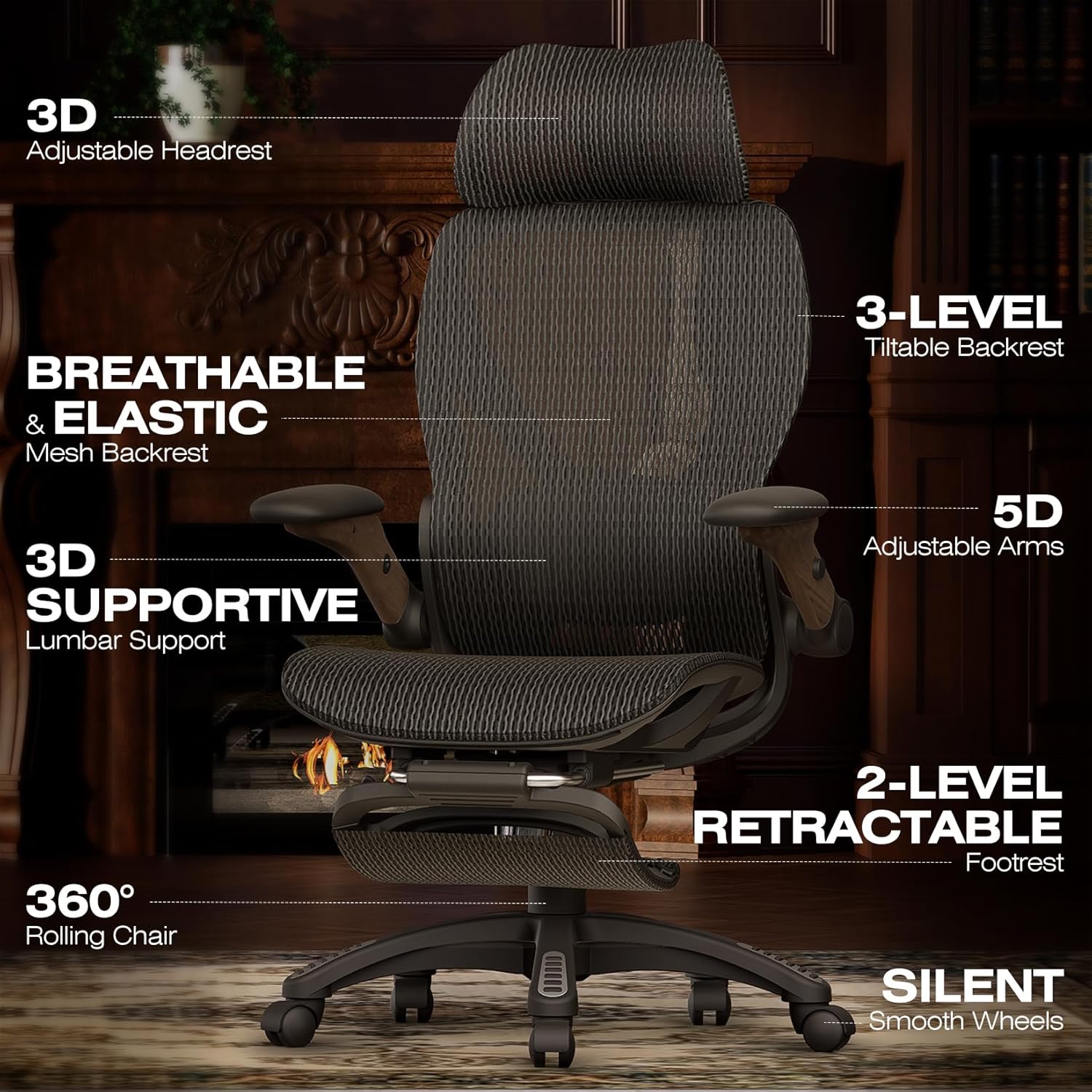 ELABEST X100 Ergonomic Office Chair with Footrest, Big and Tall Home Desk Chair with 5D Flip-Up Arms, Adjustable 5D Lumbar Support,High Back Rolling Computer Chair, Swivel Mesh Chairs (Library Oak)