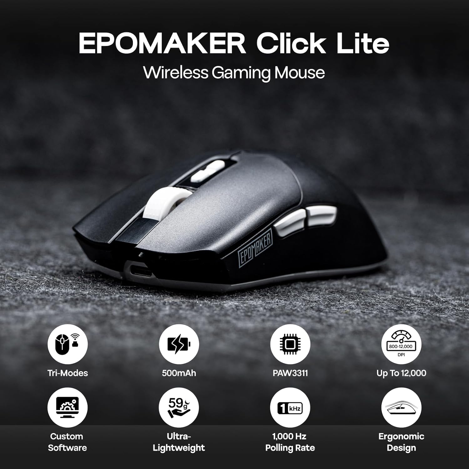 EPOMAKER Click Lite Wireless Gaming Mouse, 800 to 12,000 DPI Adjustable, PAW3311 Sensor, 500mAh, 59g, 2.4G/BT/USB-C Rechargeable Wireless Mouse with 5 Programmable Buttons for PC/Mac/Linux (Black)