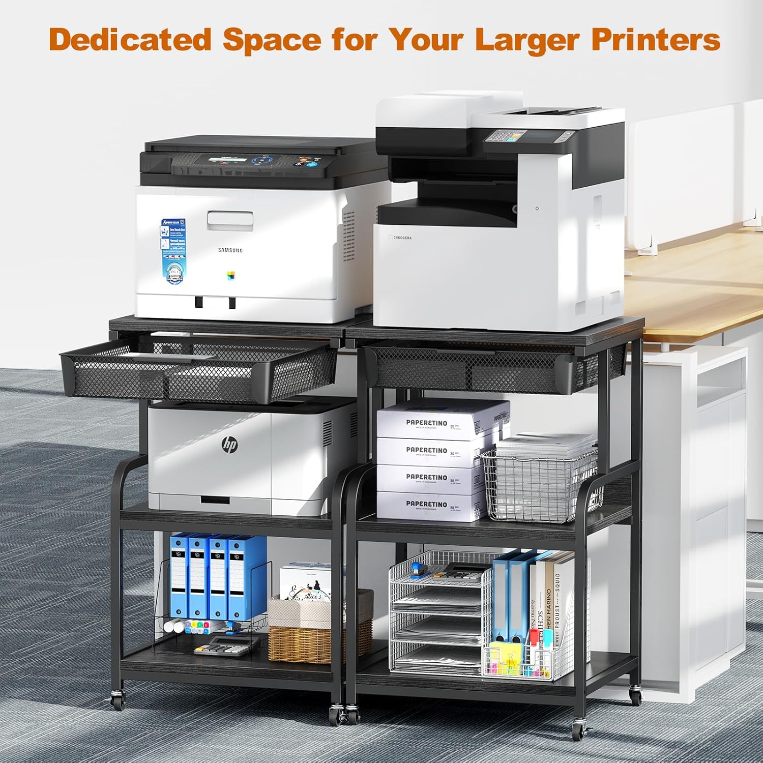 - 【Two Installation Choices】The office stand can be used with or without wheels. Not only does it make it easy to move the printer around without having to manually lift it, but it also makes it easy to clean underneath the 3-tier dual printer stand.