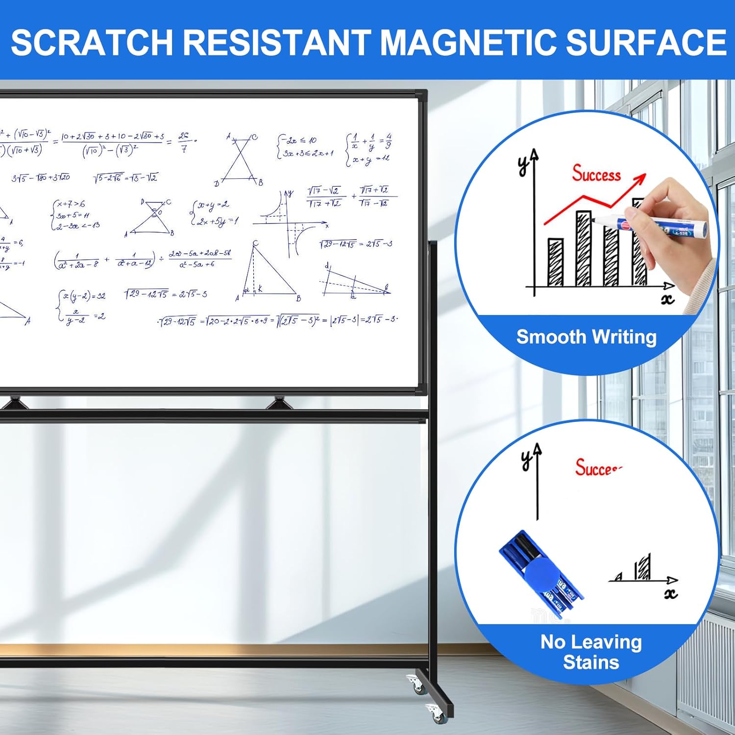 - EASY TO ERASE SURFACE & EASY FLIP DOUBLE SIDED DRY ERASE BOARD ---- Our large whiteboard 96" x 48" allows for both easy erase cleaning and protection from dents and scratches. Quick Flip Over Reversible Feature, Flip the board to the other side with the press of a button. You have TWICE the writing space when you utilize BOTH sides of the portable writing whiteboard with stand.