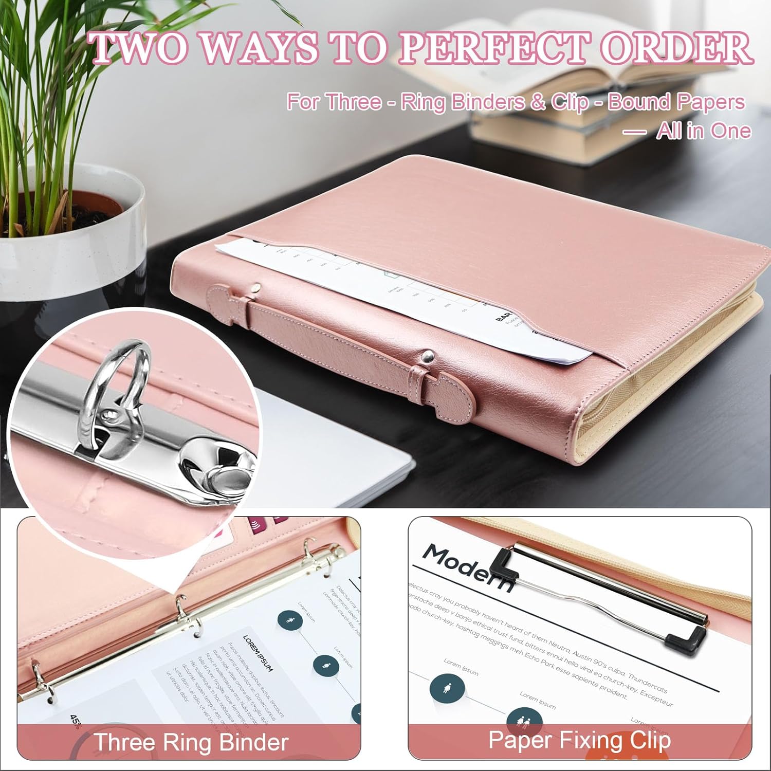 Faux Leather Portfolio Binder with Handle & Clipboard, Zippered Padfolio Folder Organizer 3 Ring Binder for Document, Business Card Holder, Professional Portfolio Notebook for Men & Women (Rose Gold)