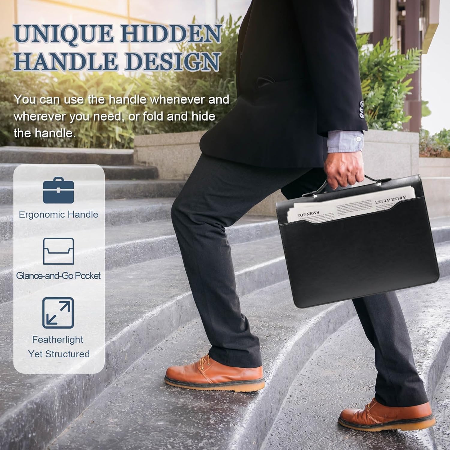 - 【Portfolio Binder with Retractable Handle】This portfolio folder organizer features a hidden and sturdy handle for easy carrying, ensuring your important documents are securely stored and quickly accessible when needed. Perfect for any setting, including meetings, client presentations, or interviews. Its lightweight design and smart organization provide convenience for your daily life and work.