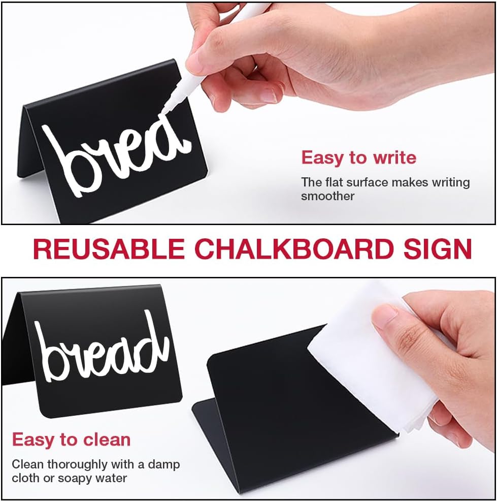 - V-shape Food Signs: Both chalk and markers can be used to write on the labels. Use different colored pens to showcase your personal style. 30pcs chalkboard signs are sufficient for use and replacement