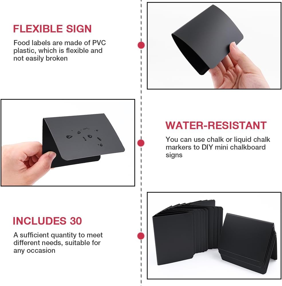 - Set Includes: Each set contains 30 black plastic chalkboard signs, sufficient for large events and various types of activities. Size: 4 x 3 inches. Tip: Avoid outdoor use; labels may deform when exposed to sunlight for extended periods