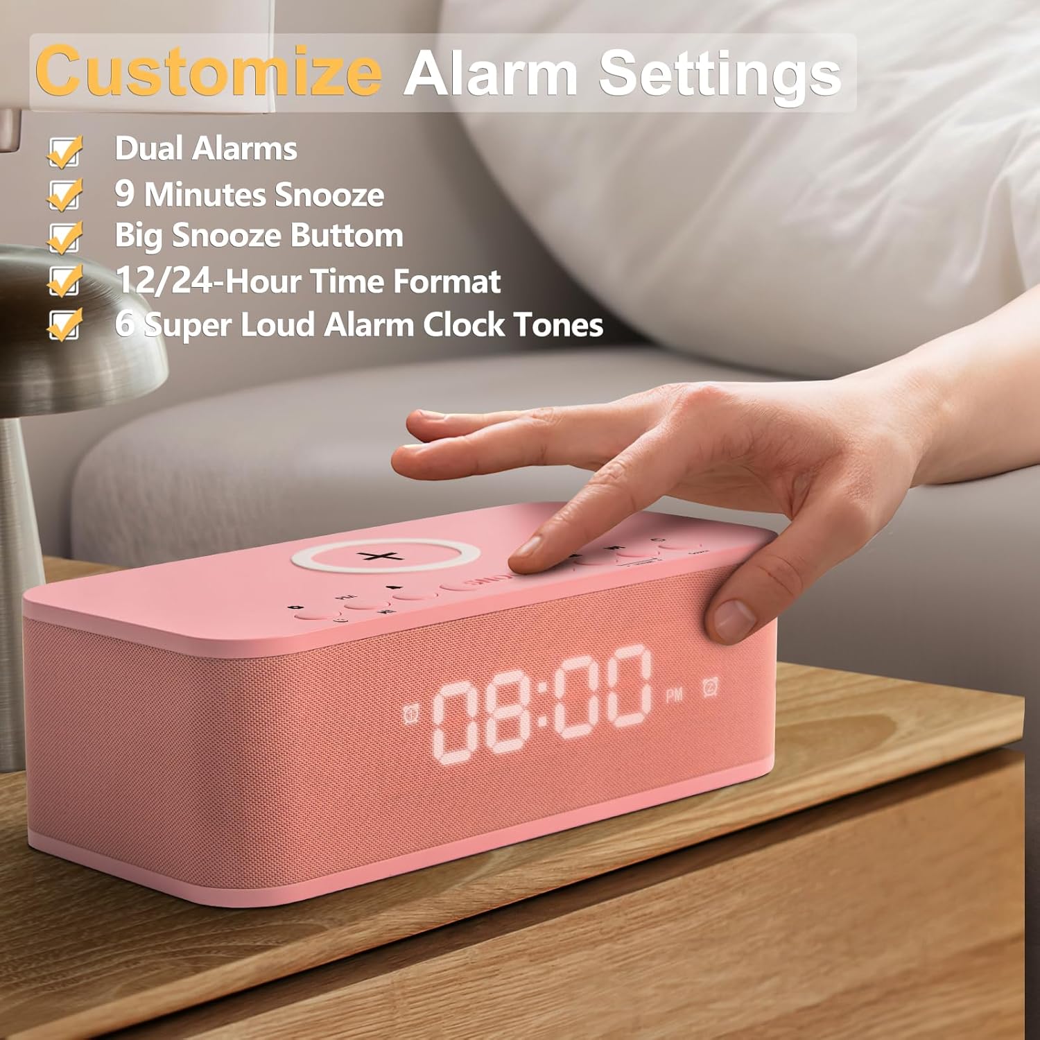 Alarm Clocks Large Snooze Button, Digital Clock USB Charger Port, Bluetooth Speaker Alarm Clock Bedroom AUX USB Bluetooth Speaker Wireless Charging 12/24H Dual Alarms Snooze Dimmer Sleep Timer, Pink